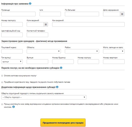 На стартовій сторінці Системи надання послуги попередньої реєстрації документів про призначення житлової субсидії, Заявнику пропонується обрати один з варіантів реєстрації/входу