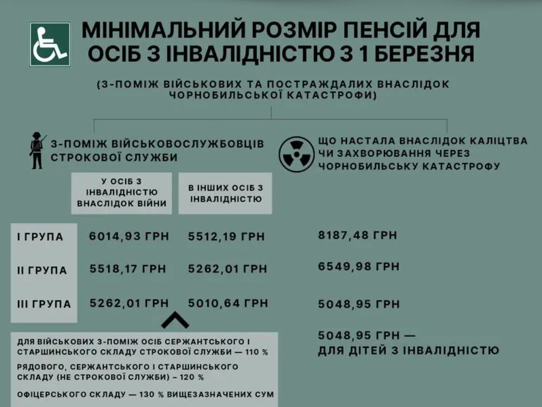 З 1 березня пенсії по інвалідності в осіб з інвалідністю з-поміж військовослужбовців строкової служби не можуть бути меншими: