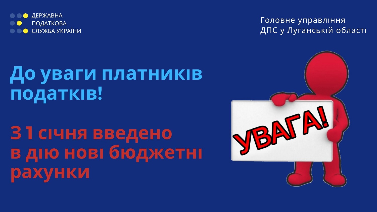 У Головному управлінні ДПС у Луганській області звертають увагу. З 1 січня 2021 року, у зв’язку зі змінами в адміністративно-територіальному устрої, відкриваються нові бюджетні рахунки для сплати податків.