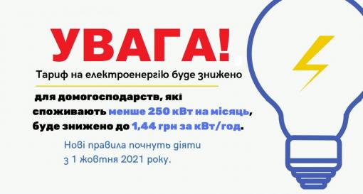Для 80% населення України тариф на електроенергію з 01 жовтня 2021 року становитиме 1,44 грн за кВт*год за умови споживання до 250 кВт*год на місяць. Для всіх, хто споживає більше 250 кВт*год на місяць, ціна залишатиметься незмінною – 1,68 грн за весь обсяг споживання.