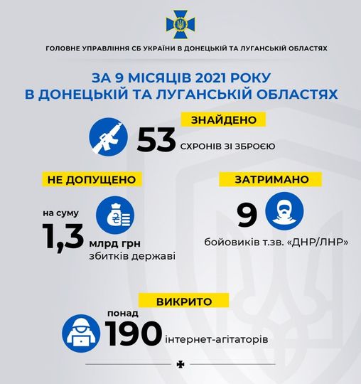 Також викрито 190 інтернет-агентів, які діяли в інтересах спецслужб РФ. Зловмисники закликали до захоплення державної влади та порушення територіальної цілісності України.