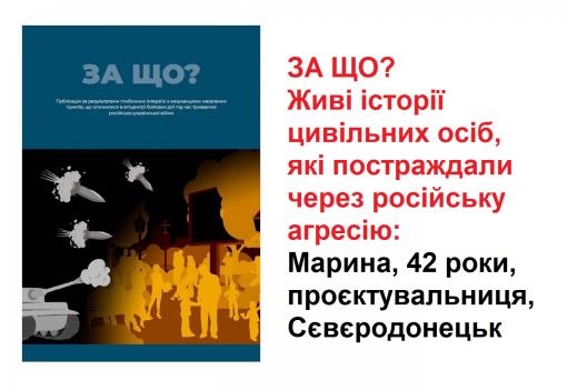 ЗА ЩО? Живі історії цивільних осіб, які постраждали через російську агресію: Марина, 42 роки, проєктувальниця, Сєвєродонецьк