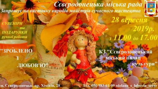 - 11.00-17.00 Виставка сучасного мистецтва «Зроблено з любов’ю»; (виставка майстрів народного мистецтва, майстер-класи, етнічна українська фотозона)