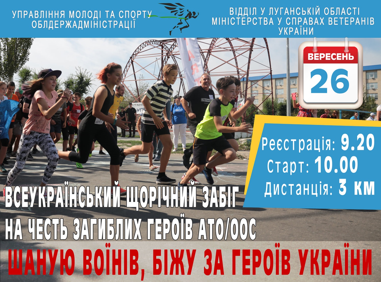 Забіг «Шаную воїнів, біжу за героїв України» розпочнеться 26 вересня о 10.00 у Сєвєродонецьку (реєстрація учасників розпочнеться о 9.20 біля будівлі Луганської ОДА). Дистанція забігу – 3 км.