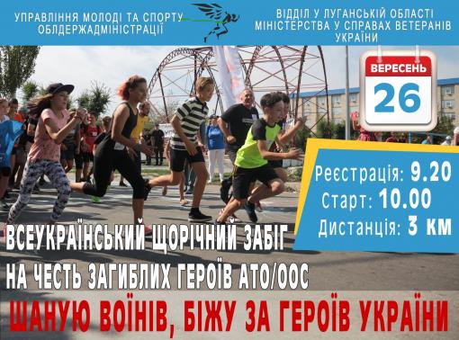 Всеукраїнський патріотичний забіг з легкої атлетики в пам'ять про загиблих воїнів «Шаную воїнів, біжу за героїв України» відбудеться в місті Сєвєродонецьк 26 вересня.