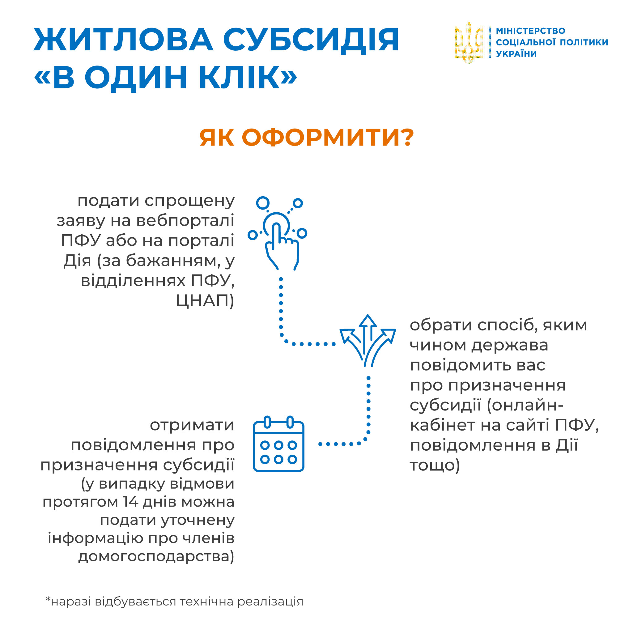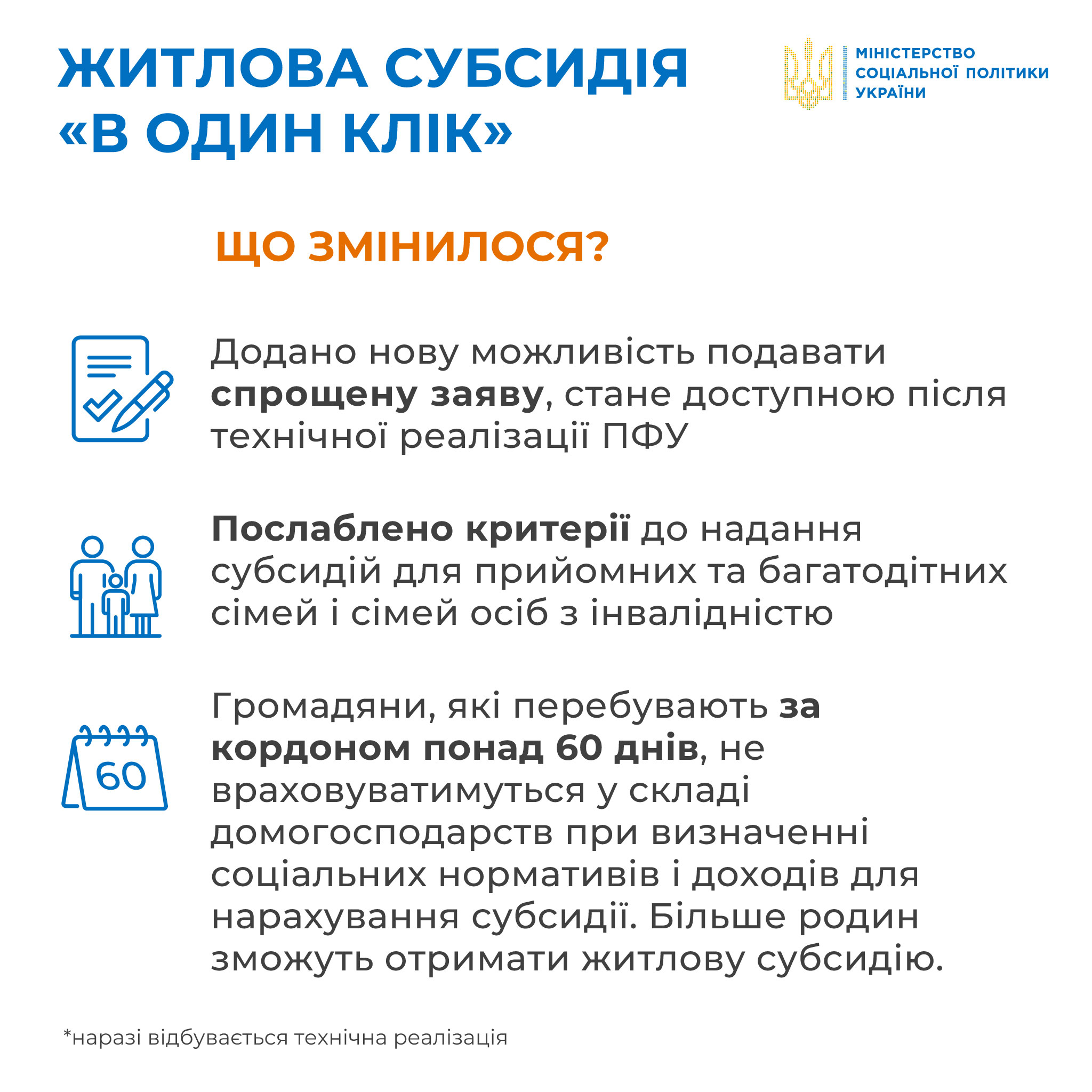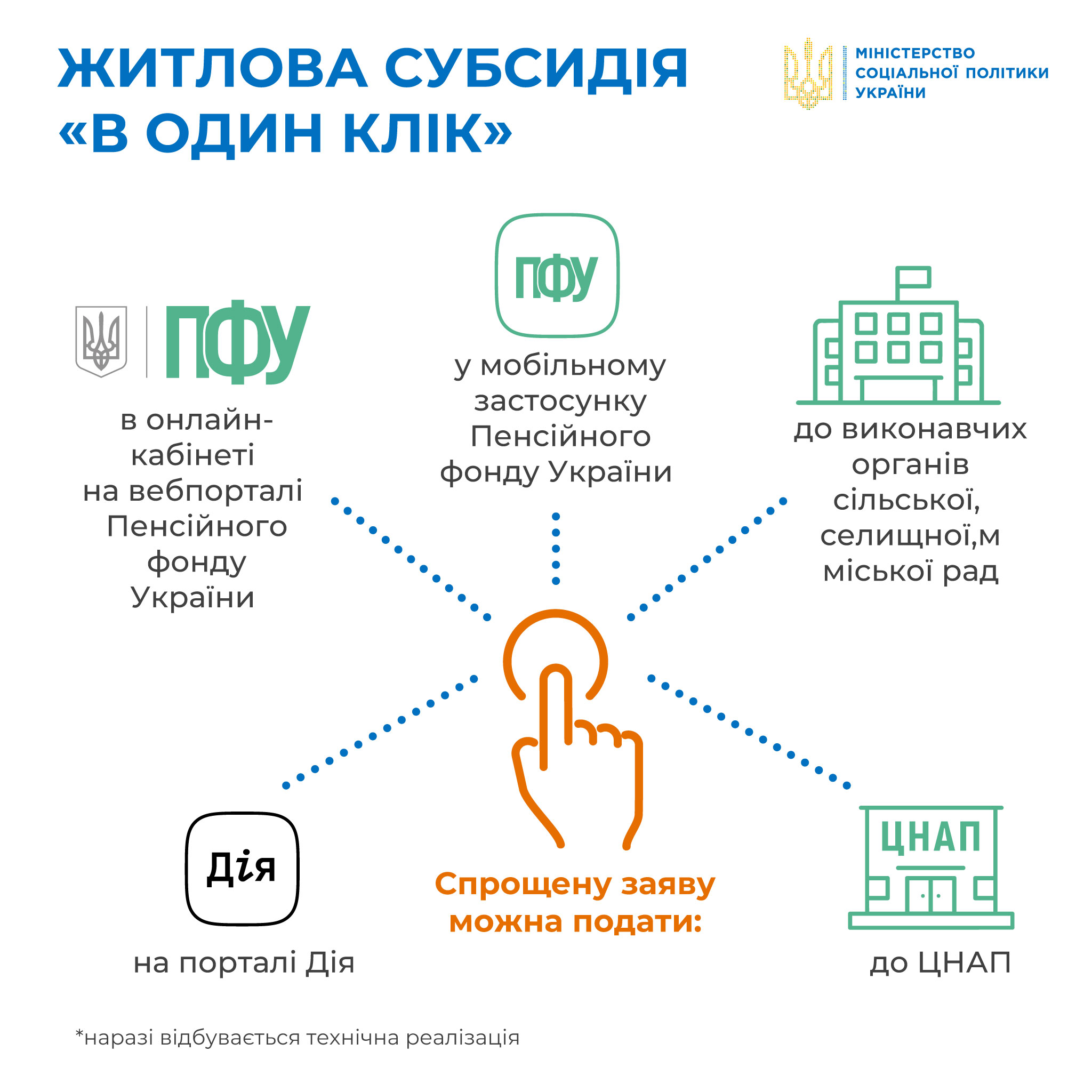 Українці зможуть подавати спрощені заяви на призначення житлової субсидії “в один клік”. Це буде можливо зробити в онлайн-кабінеті на вебпорталі Пенсійного фонду України , мобільному додатку Пенсійного фонду України, на Порталі Дія або - за бажанням - у відділеннях Пенсійного фонду, ЦНАПів і тд.