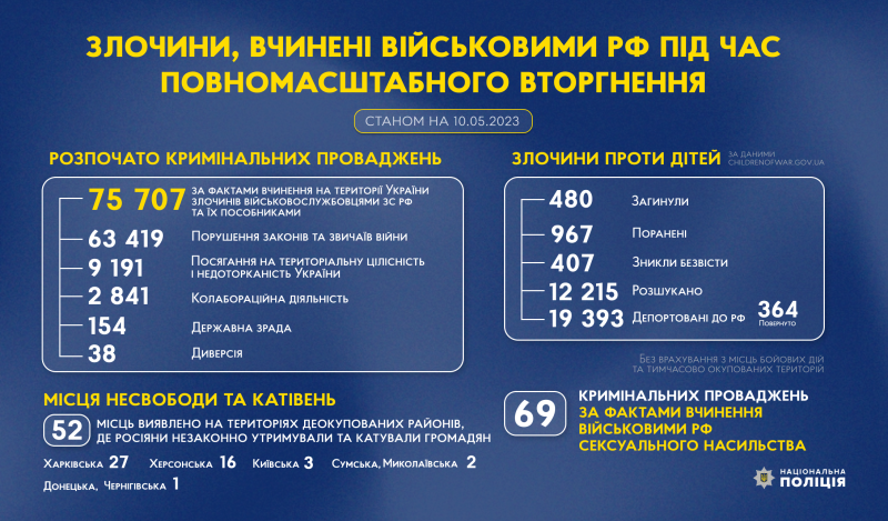 Зпочатку повномасштабного вторгнення росії в Україну слідчі Національної поліції розпочали 75 707 кримінальних проваджень за фактами вчинення на території України злочинів військовослужбовцями збройних сил російської федерації та їхніми пособниками.