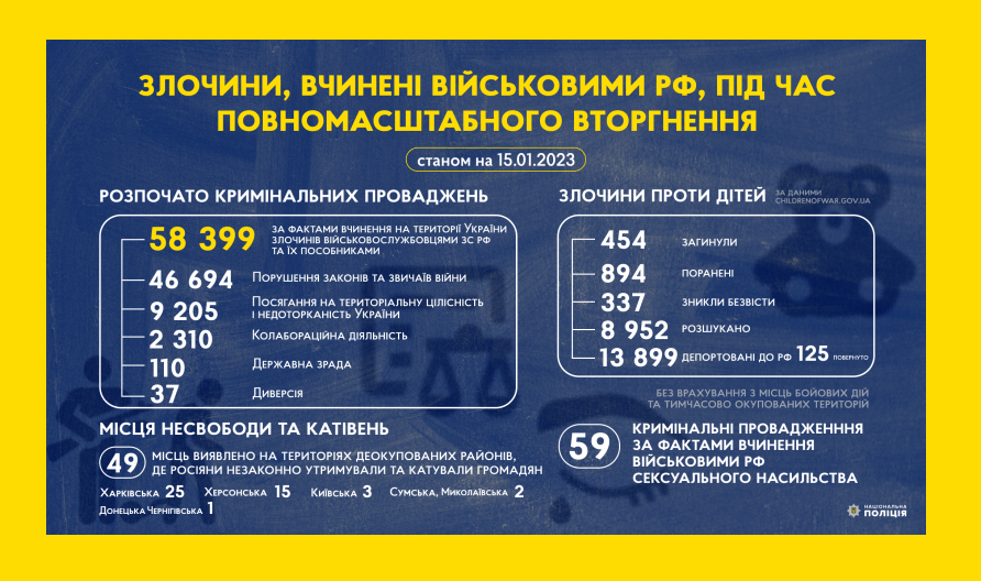 З початку повномасштабного вторгнення росії в Україну слідчі Національної поліції України розпочали 58 399 кримінальних проваджень за фактами вчинення на території України злочинів військовослужбовцями збройних сил російської федерації та їхніми пособниками.