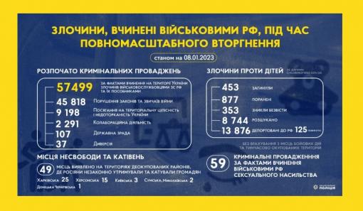 Від початку воєнної агресії росії в Україну слідчі Національної поліції України розпочали 57499 кримінальних проваджень за фактами вчинення на території нашої держави злочинів військовослужбовцями збройних сил рф та їхніми пособниками.