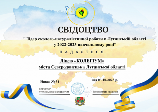 Згідно з наказом КЗ «ЛУГАНСЬКИЙ ОБЛАСНИЙ ЦЕНТР ЕКОЛОГО-НАТУРАЛІСТИЧНОЇ ТВОРЧОСТІ УЧНІВСЬКОЇ МОЛОДІ» від 03.10.2023 № 31 «Про відзначення лідерів еколого-натуралістичної роботи серед закладів освіти Луганської області у 2022-2023 навчальному році», враховуючи багаторазову участь у всеукраїнських тематичних заходах та значні результативні показники Свідоцтвом «Лідер еколого-натуралістичної роботи в Луганській області у 2022-2023 навчальному році» відзначено 23 заклади освіти, серед яких три ЗЗСО Сєвєродонецької міської територіальної громади: Гімназія № 15, Гімназія № 18 та Ліцей «КОЛЕГІУМ».