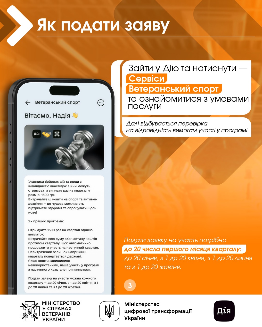 «Спільно з Мінцифрою ми запускаємо державну програму фінансової допомоги, яка сприятиме поверненню наших ветеранів і ветеранок до активного життя. Вже у січні ви можете отримати на свої банківські рахунки 1 500 грн на відвідування спортивних залів, басейнів та інших закладів фізичної культури та спорту», – зазначила Міністерка у справах ветеранів України Наталія Калмикова.