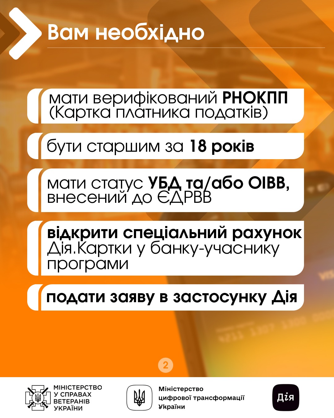 • відкрити спеціальний рахунок Дія.Картки у банку-учаснику програми