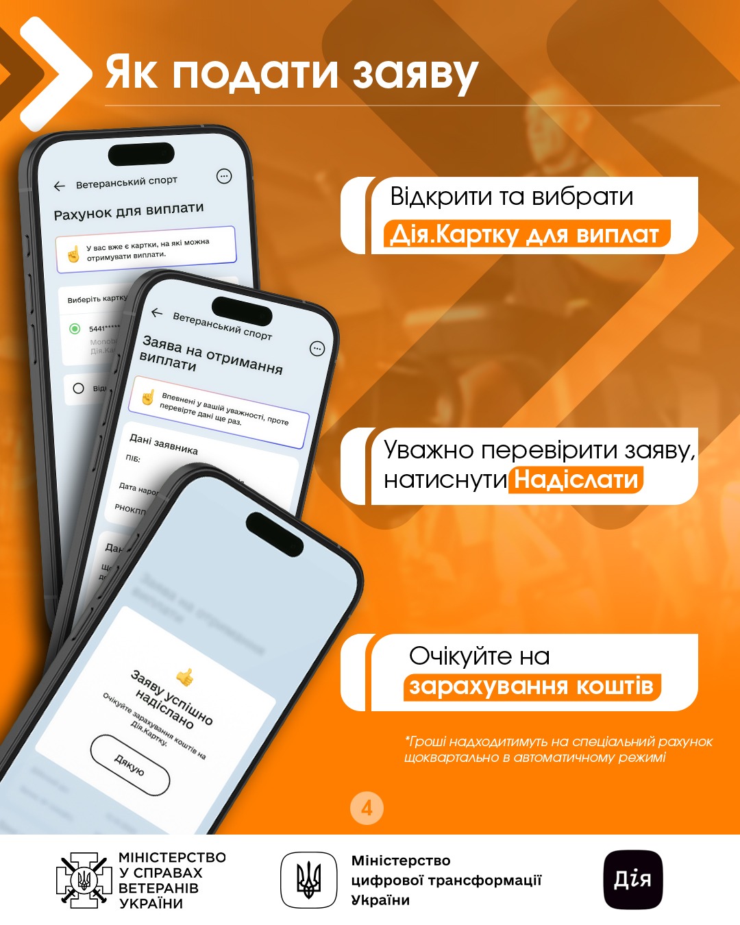 У разі повного невикористання коштів впродовж кварталу — вони повернуться на рахунки Мінветеранів, а Ви припиняєте участь у програмі. Щоб отримати виплату у наступному кварталі, потрібно повторно подати заяву у застосунку Дія.