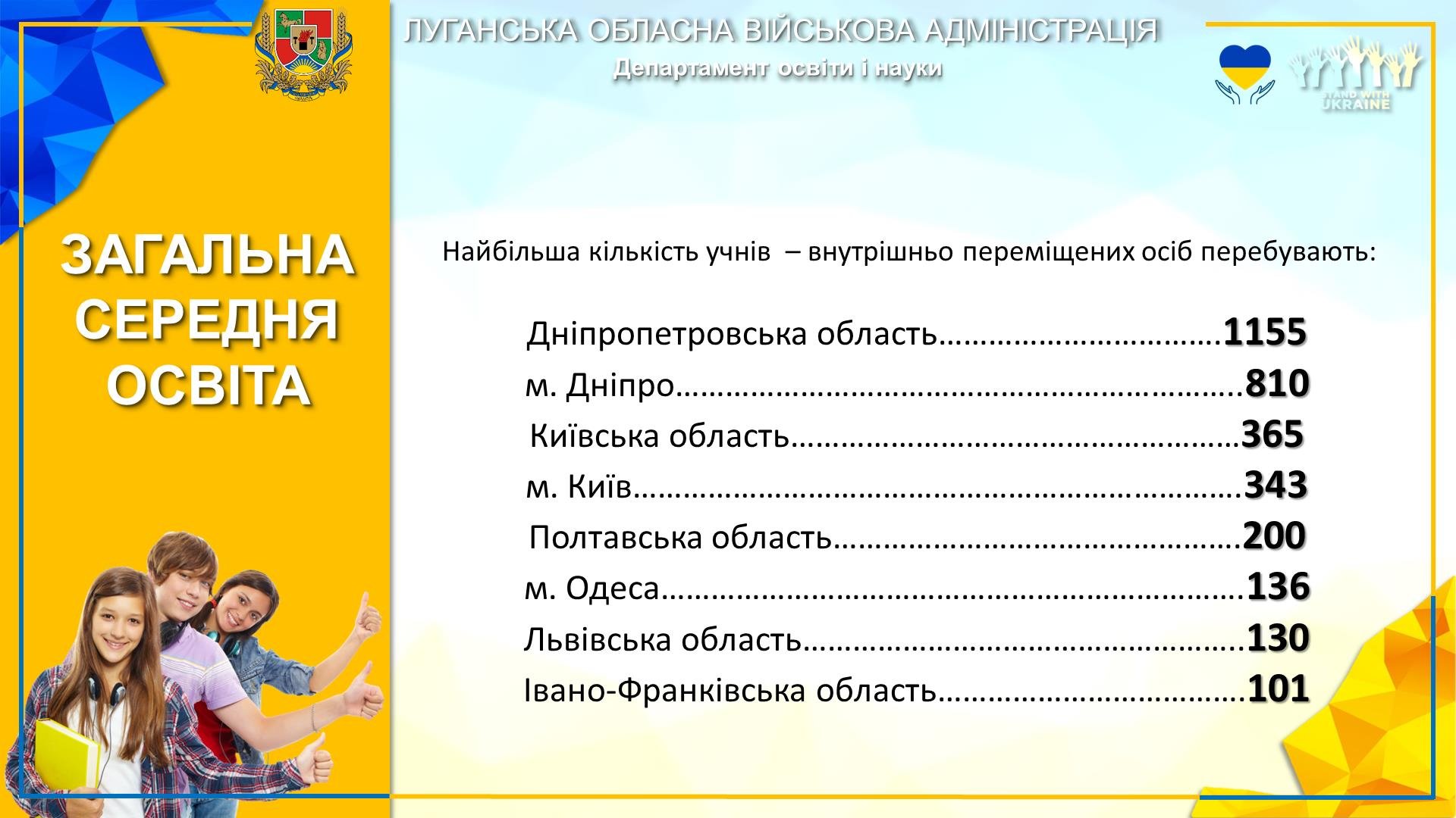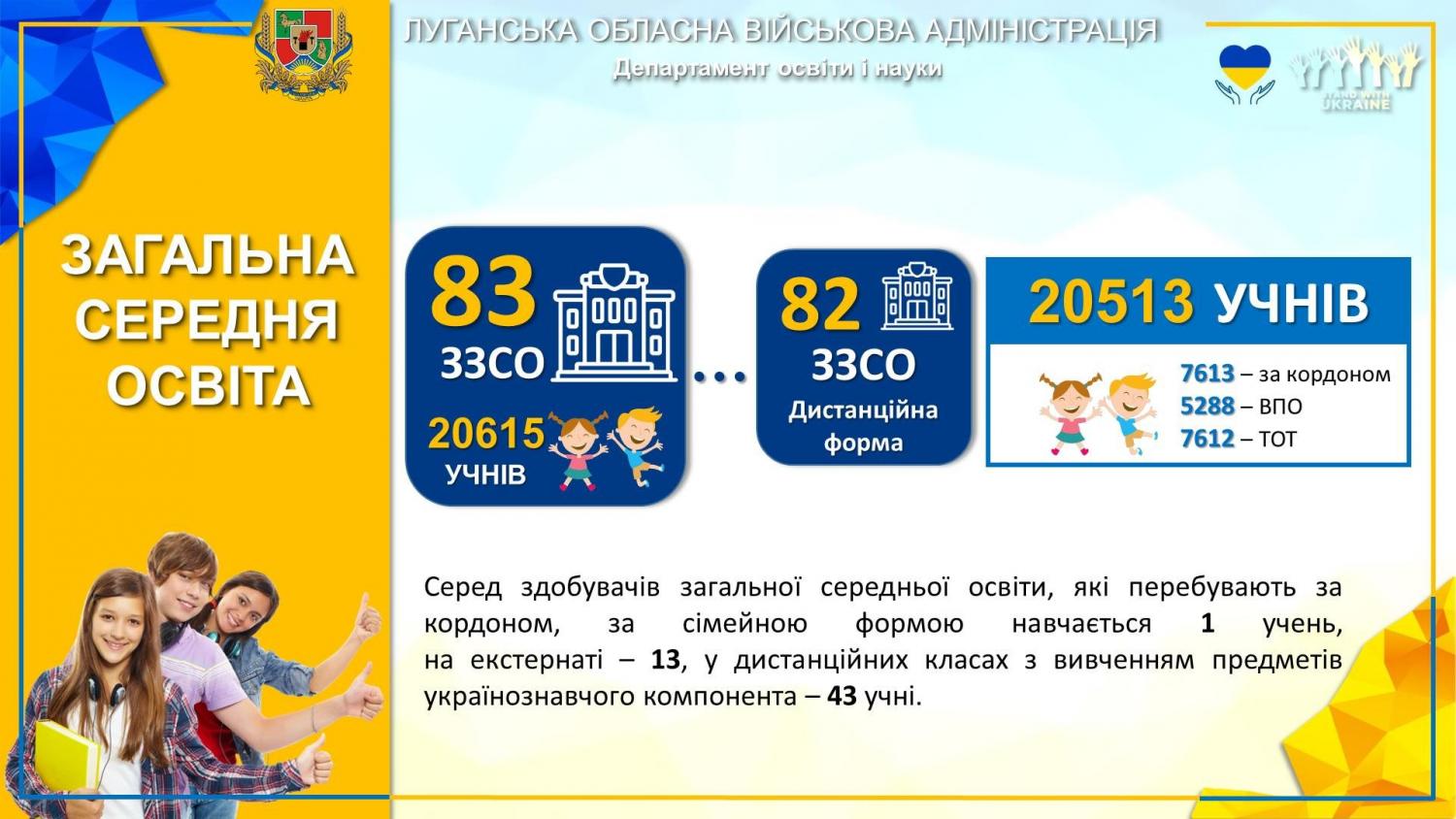 Освітній процес розпочався у 83 закладах загальної середньої освіти Луганської області, у 82 школах - за дистанційною формою. Усього до навчання стали 20615 учнів.