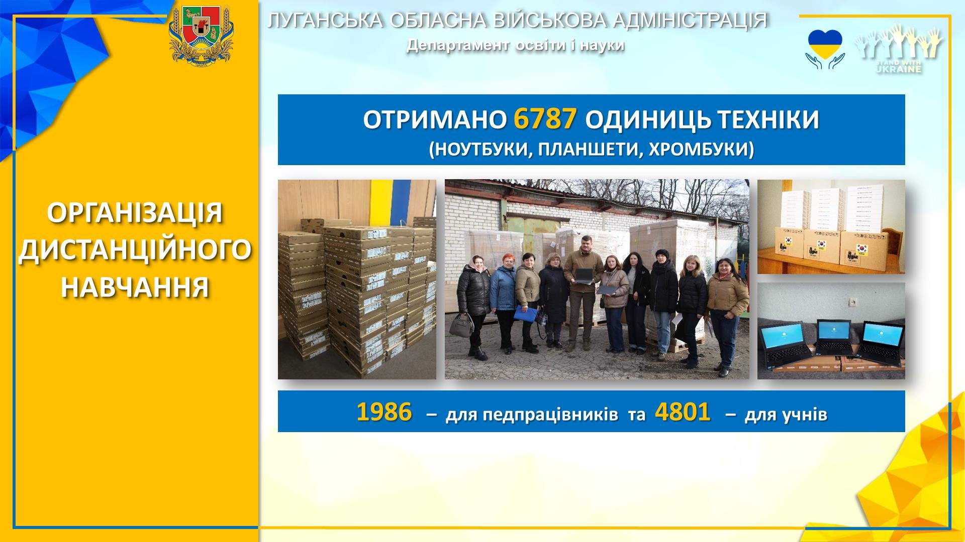 Для якісної організації онлайн-навчання, забезпечення учнів та педагогічних працівників ноутбуками, хромбуками, планшетами отримано 6787 девайсів від міжнародних партнерів, з них: 4801 - для учнів, 1986 - для педпрацівників.