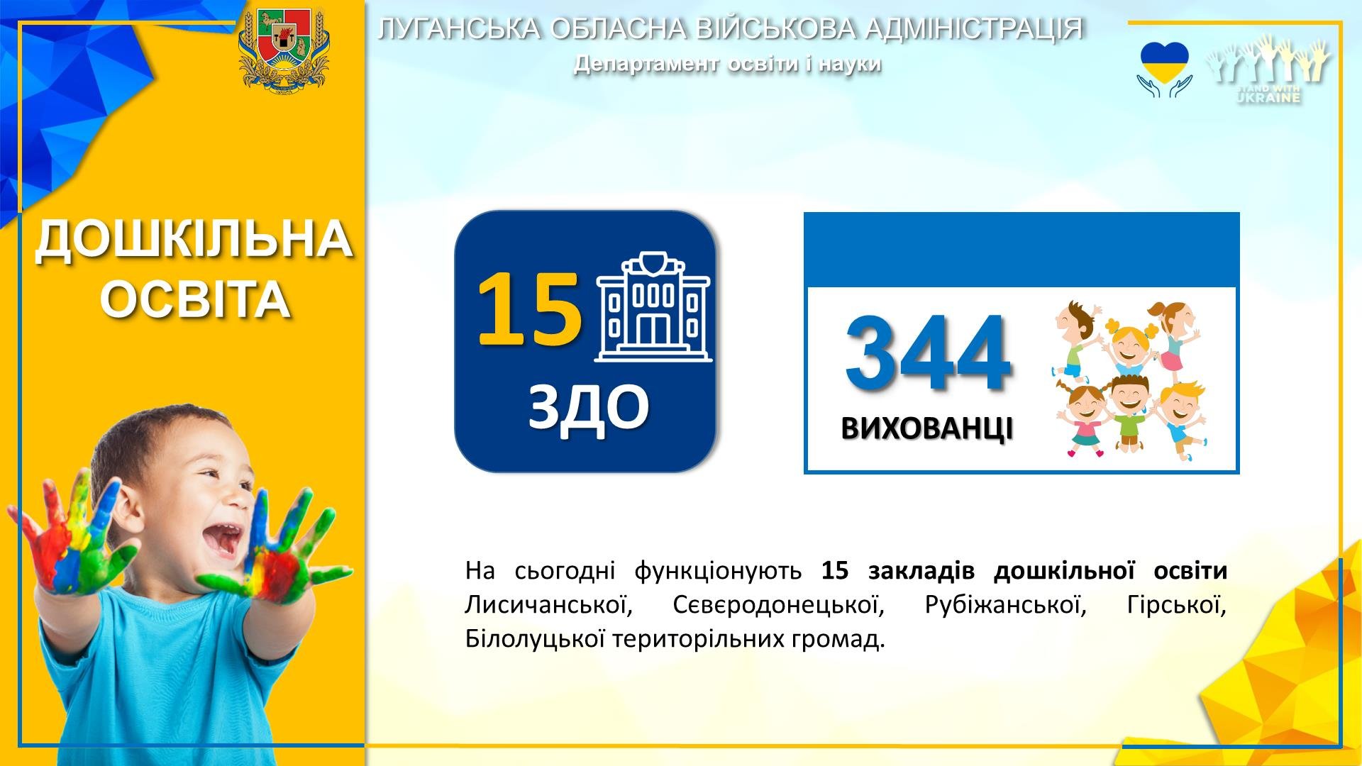 У 15 закладах дошкільної освіти області Лисичанської, Сєвєродонецької, Рубіжанської, Гірської та Білолуцької територіальних громад здобувають освіту в дистанційному режимі 344 вихованці.