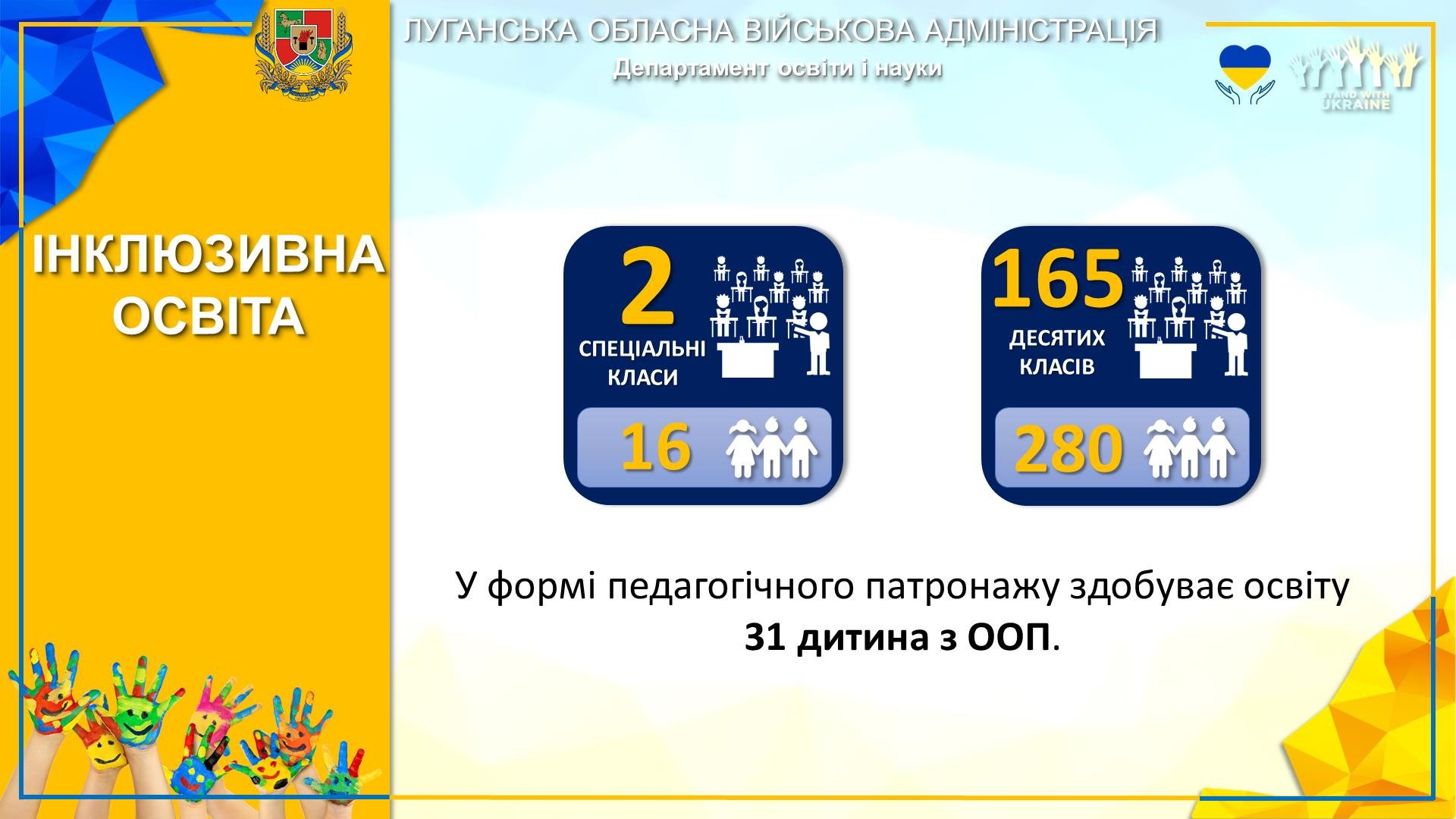 Для створення умов для здобуття освіти дітьми з особливими освітніми потребами функціонують два спеціальні класи (16 учнів) та 165 інклюзивних класів (280 учнів). У формі педагогічного патронажу здобуває освіту 31 дитина з ООП.