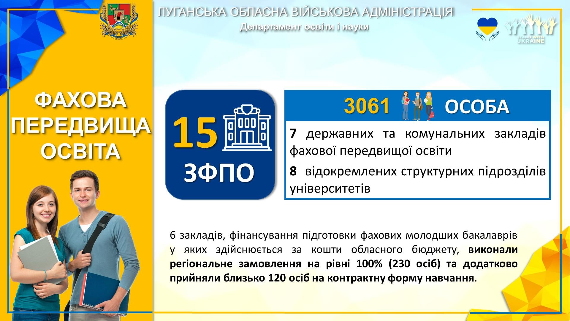 Молодших бакалаврів у дистанційному форматі готують вісім відокремлених структурних підрозділів університетів (шість – Державного закладу «Луганський національний університет імені Тараса Шевченка» та два – Східноукраїнського національного університету імені Володимира Даля), чотири державних та три комунальних заклади фахової передвищої освіти.