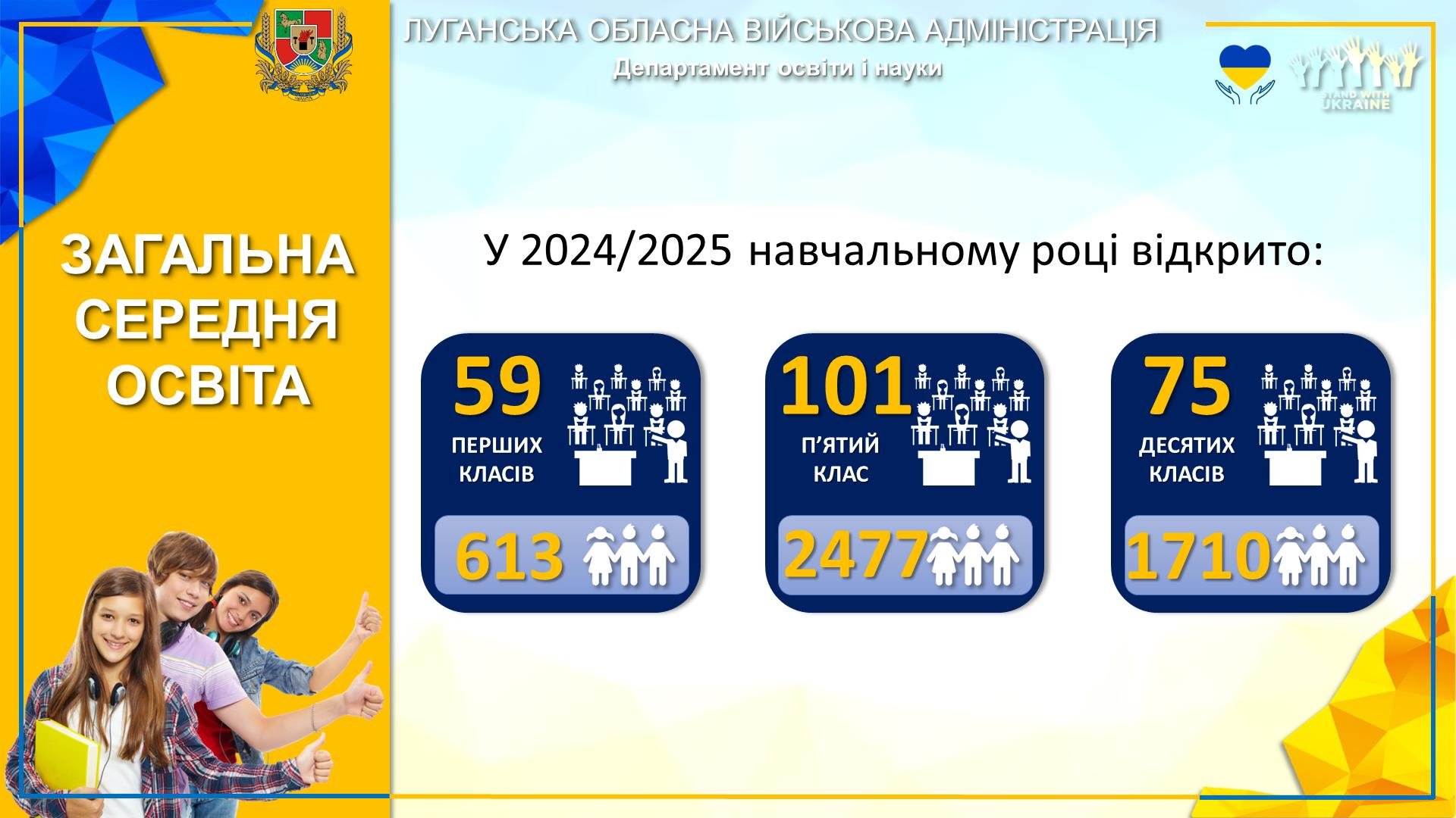 У 2024-2025 навчальному році відкрито 59 перших класів (613 учнів), 101 п’ятий клас (2477 учнів) та 75 десятих класів (1710 учнів).