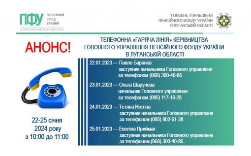 У четвер, 25 січня, із 10:00 до 11:00 відбудеться «гаряча лінія» за участі заступника начальника Головного управління Пенсійного фонду України у Луганській області Евеліни Приймак. Телефон: (068) 300-40-86.