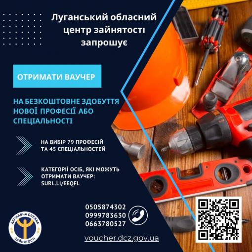 Луганський обласний центр зайнятості запрошує Вас скористатися можливістю отримати ваучер та безкоштовно здобути нову професію або спеціальність. На Ваш вибір 79 професій та 45 спеціальностей. Звертаємо Вашу увагу на те, що в Перелік професій та спеціальностей для навчання за якими може бути виданий ваучер, додали нову професію - "Сапер (розмінування)". Обирайте те, що цікавить саме Вас та звертайтеся до нас!