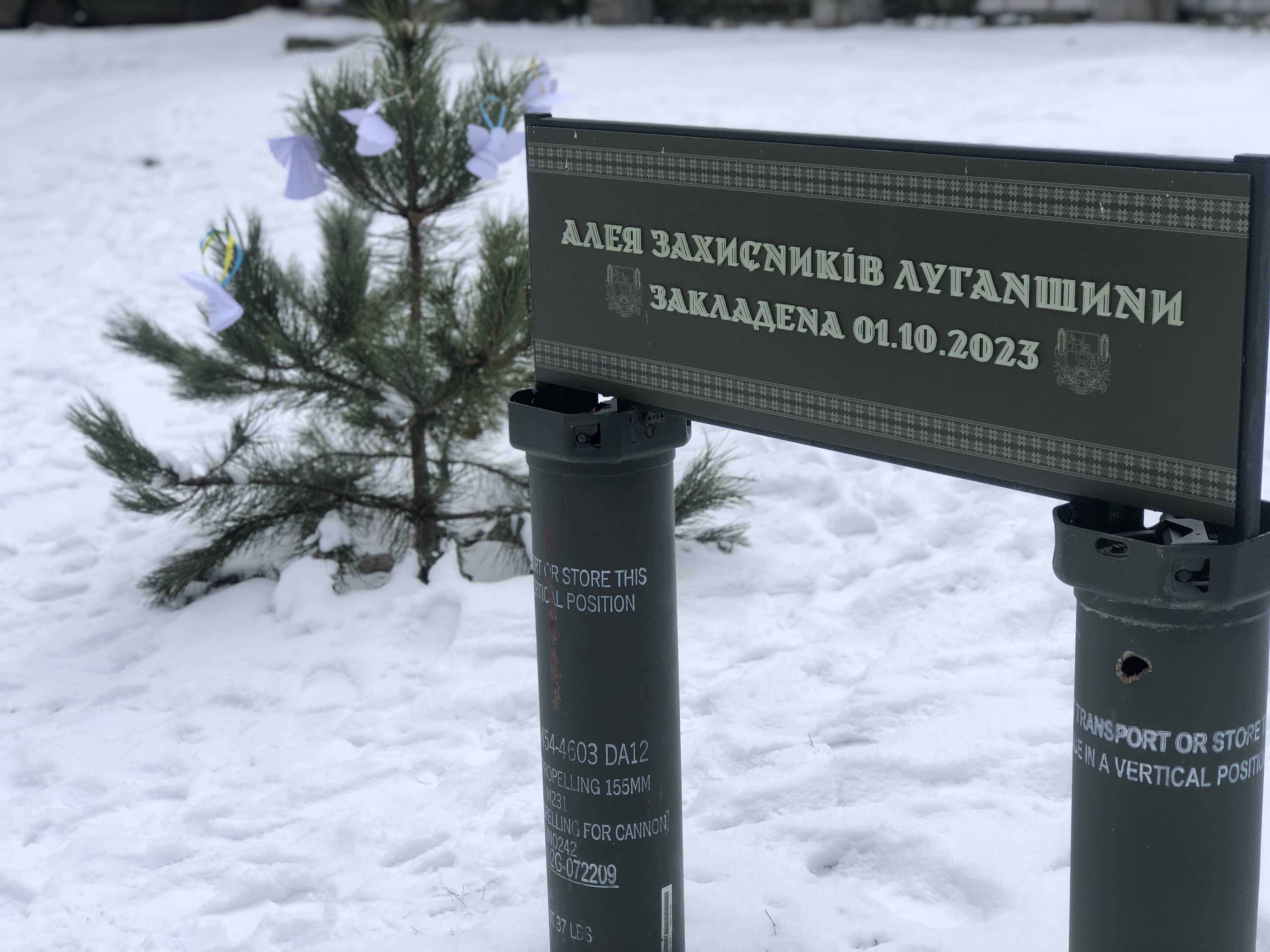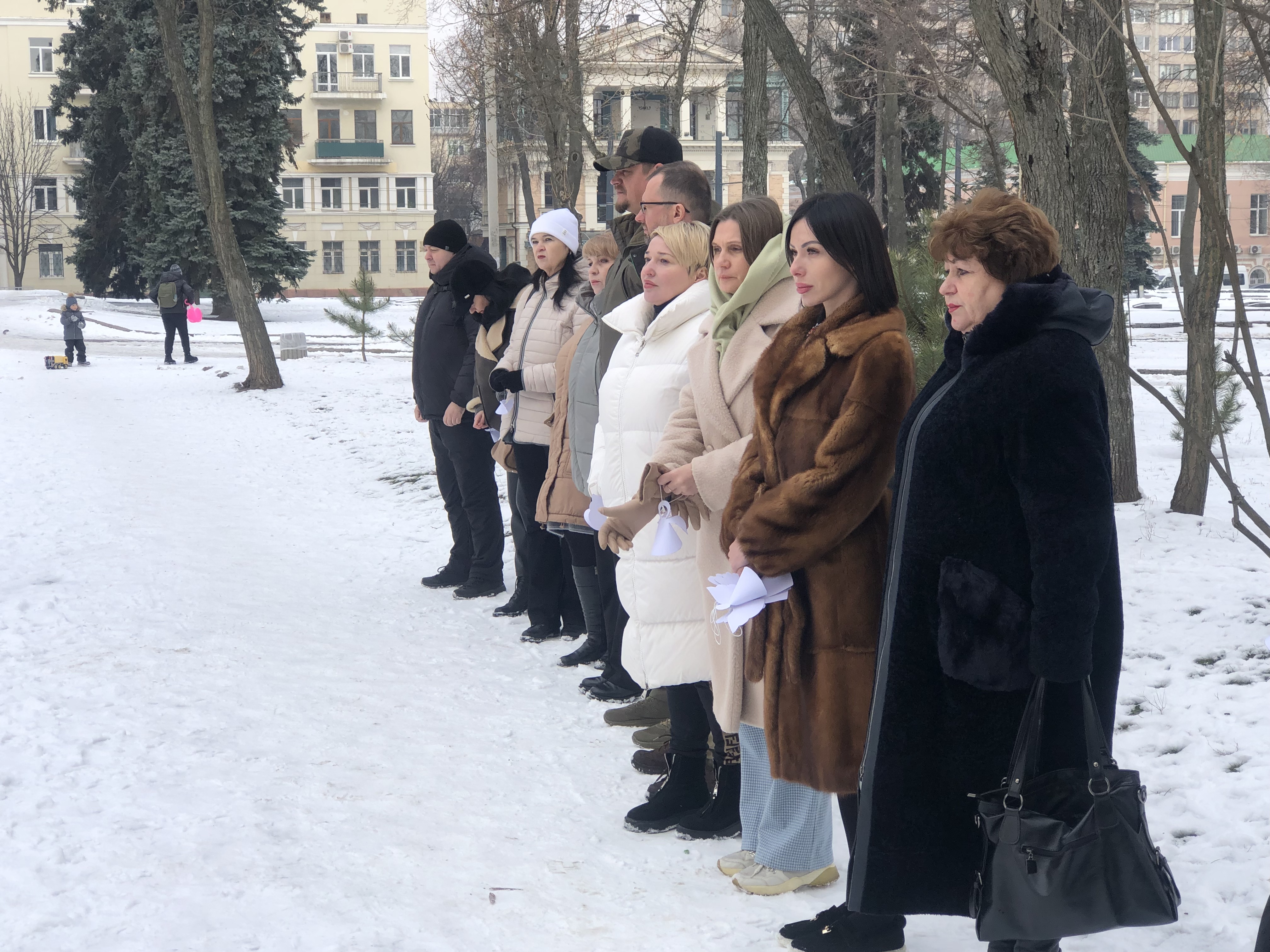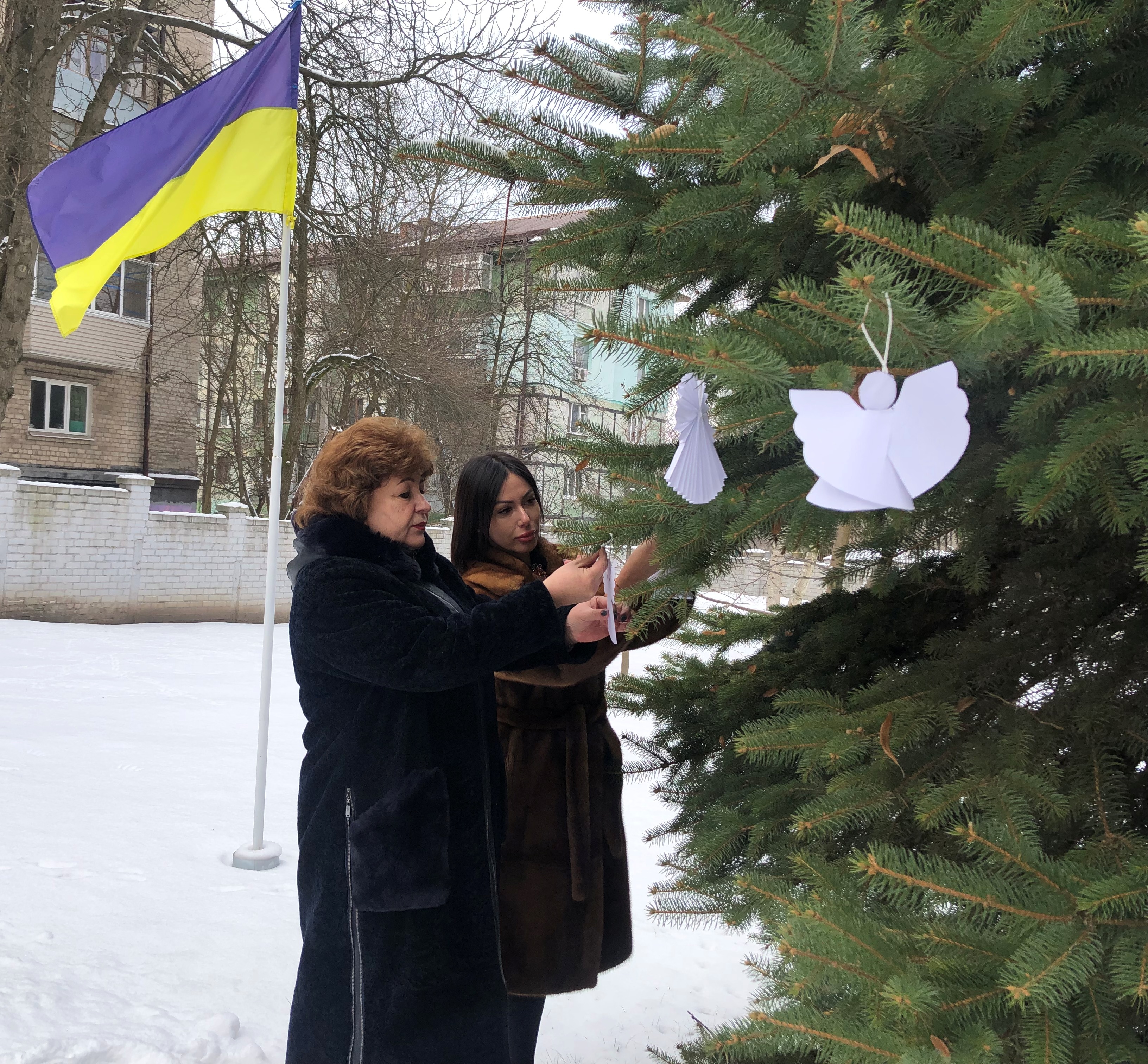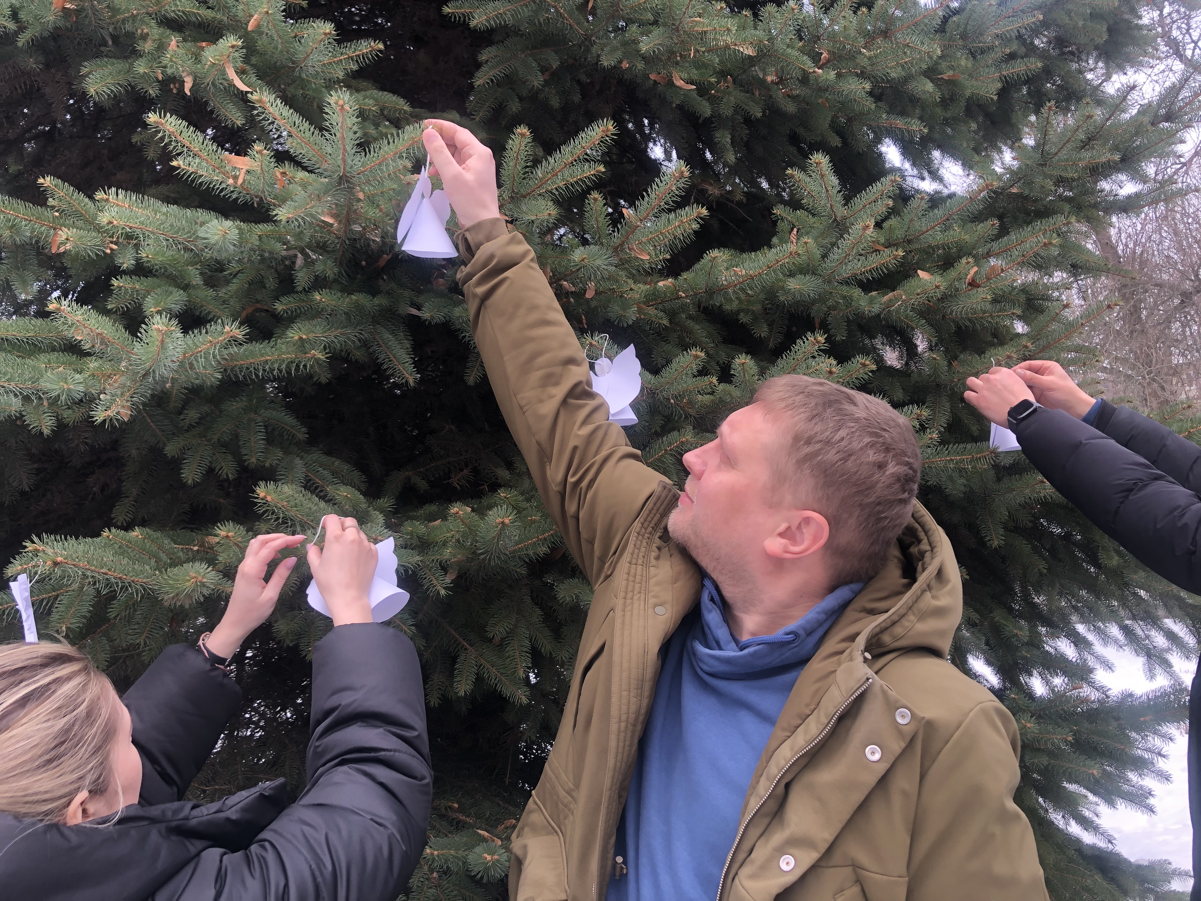 Вшанувавши хвилиною мовчання на знак пам’яті та пошани перед загиблими воїнами російсько-української війни, розвісили по деревах, саджанцях сосни, білих янголів.
