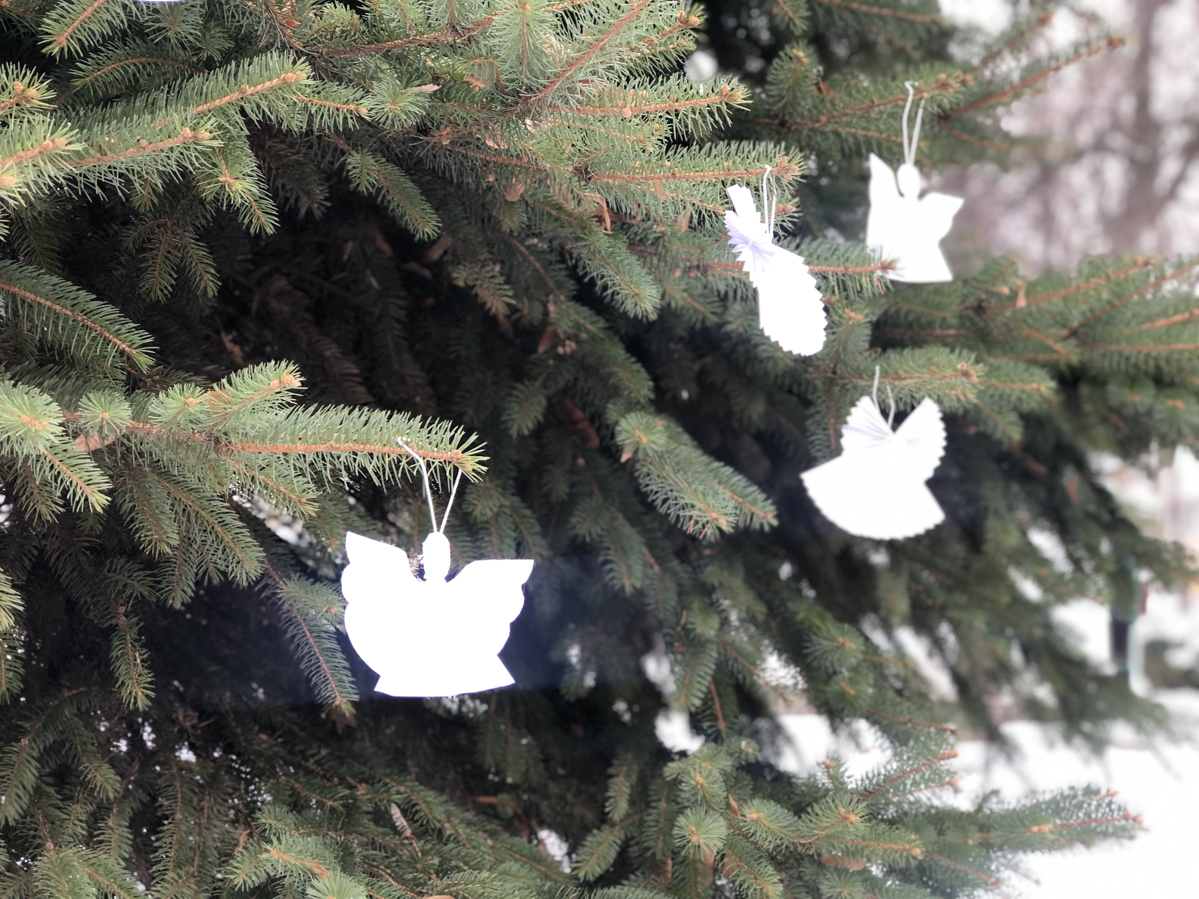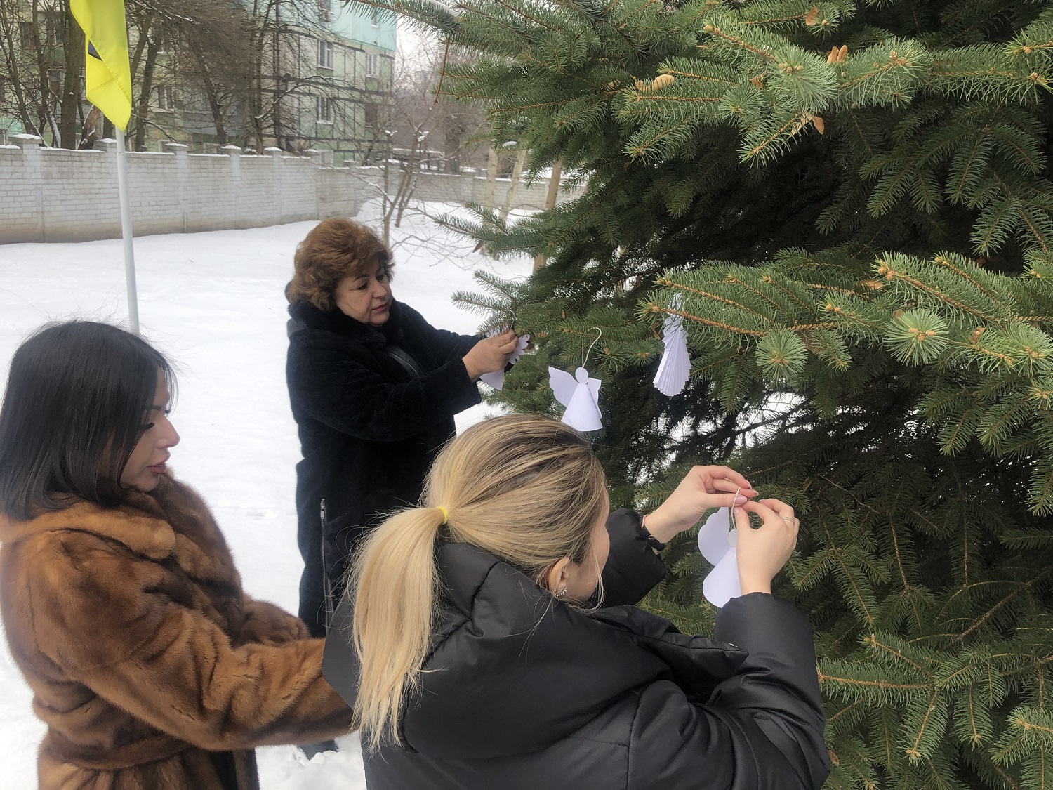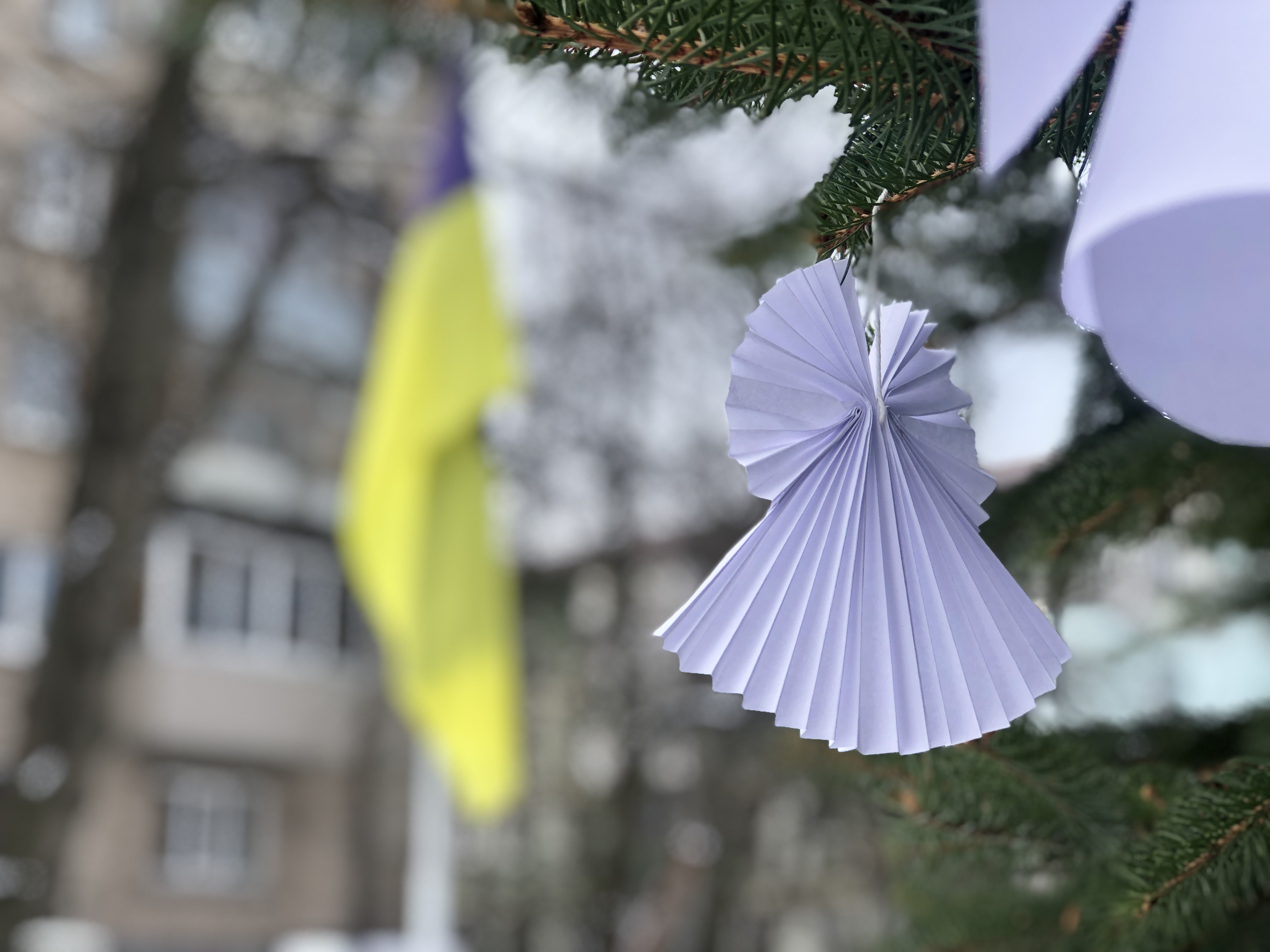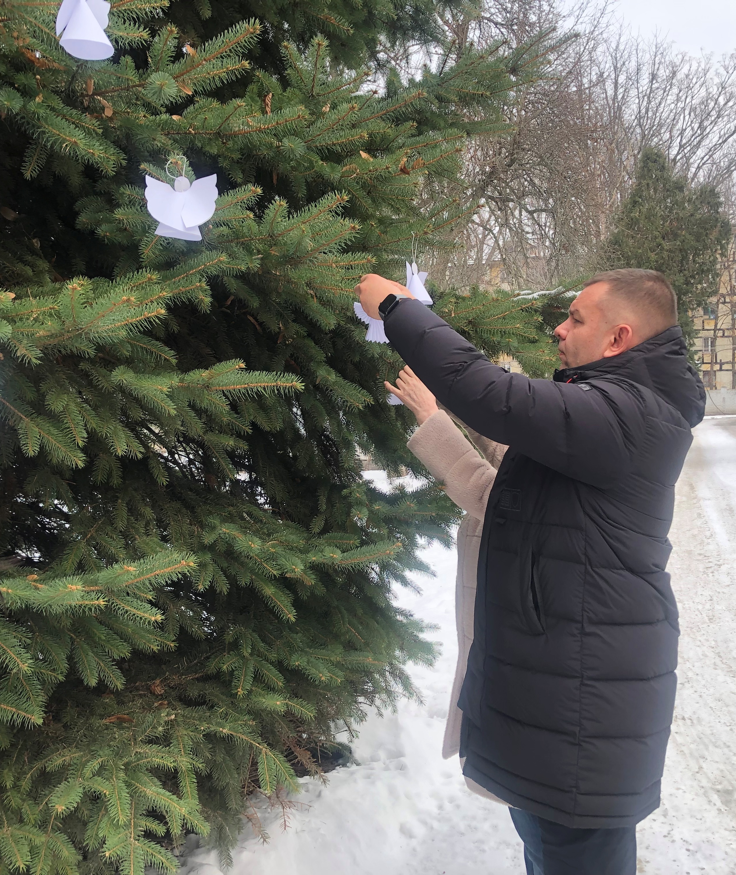 Вшанувавши хвилиною мовчання на знак пам’яті та пошани перед загиблими воїнами російсько-української війни, розвісили по деревах, саджанцях сосни, білих янголів.