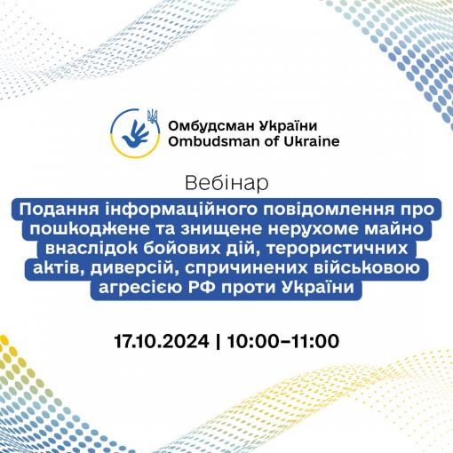 Анонс! 17 жовтня відбудеться вебінар «Подання повідомлення про пошкоджене та знищене нерухоме майно внаслідок збройної агресії РФ проти України»