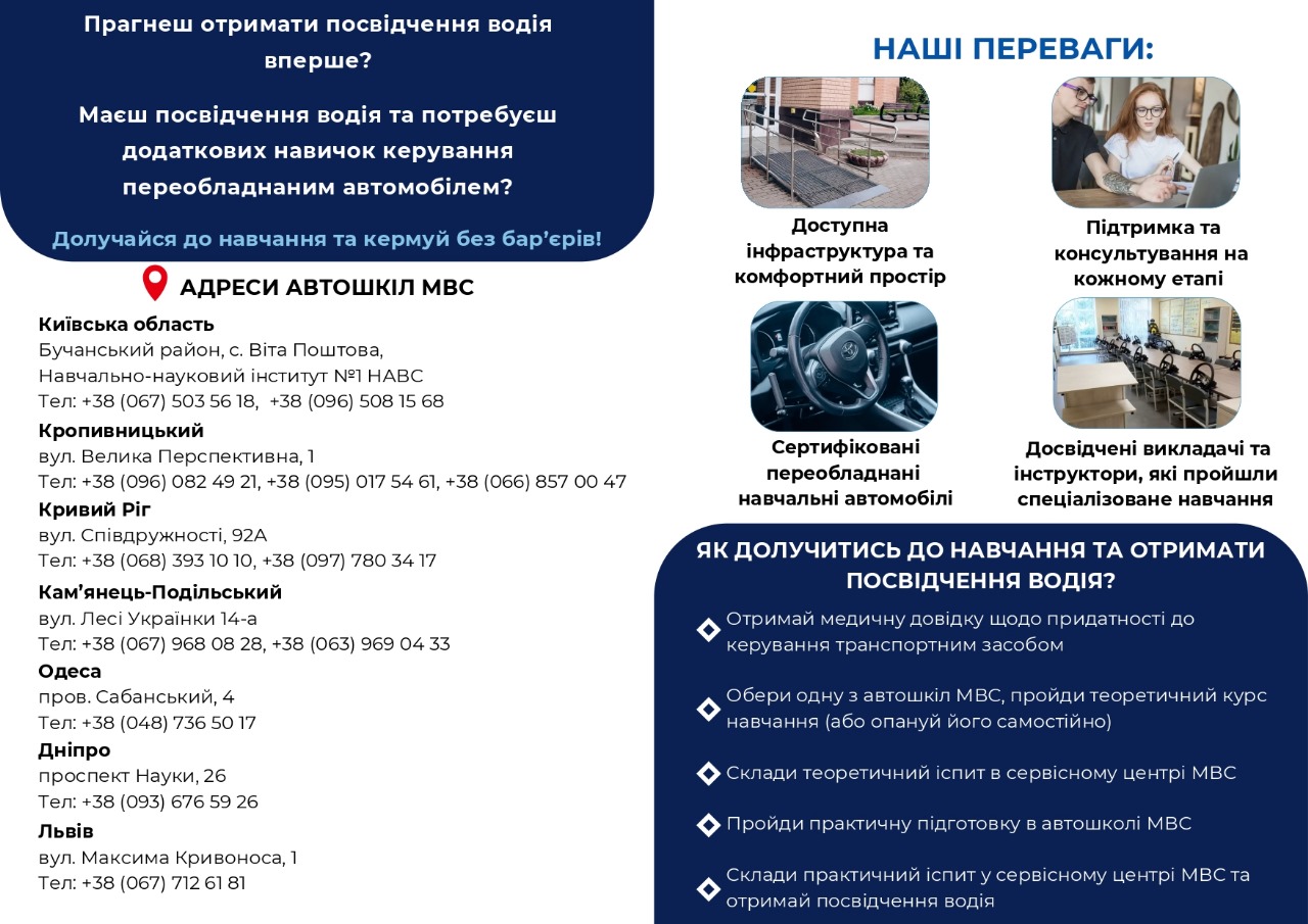 «Автошколи для осіб з інвалідністю» – це флагманський проєкт Міністерства внутрішніх справ України, який реалізується у рамках ініціативи «Без бар’єрів» Першої леді України Олени Зеленської