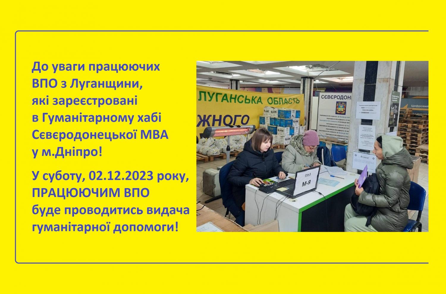 До уваги працюючих ВПО з Луганщини, які зареєстровані в Гуманітарному хабі Сєвєродонецької МВА у м.Дніпро!