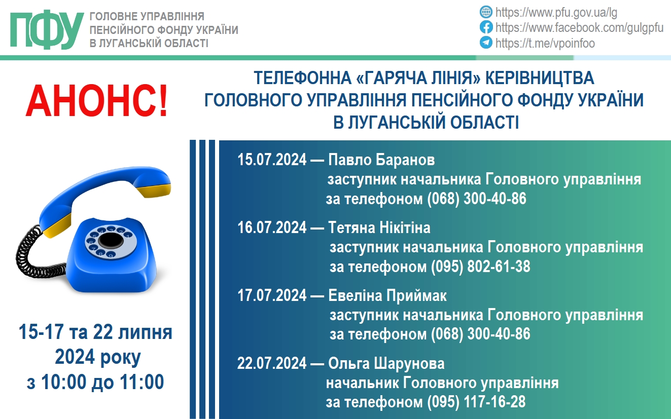 До уваги ВПО Луганської області! 15-17 та 22 липня "гаряча лінія" керівництва ГУ ПФУ в Луганській області