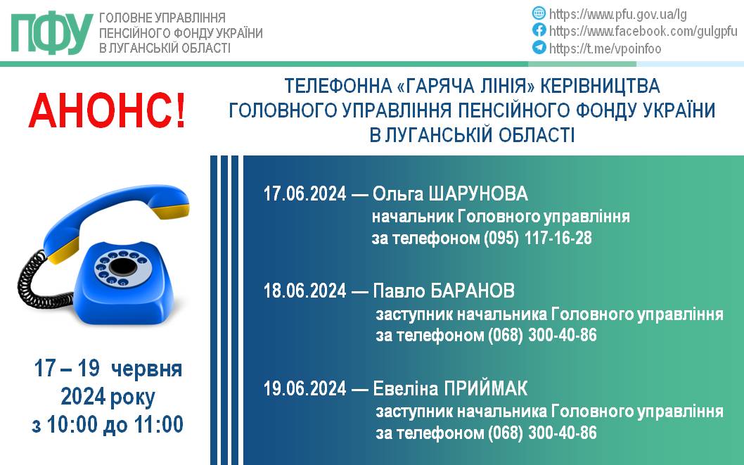 До уваги ВПО Луганської області! 17-19 червня "гаряча лінія" керівництва ГУ ПФУ в Луганській області