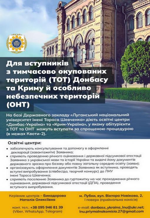 На базі Державного закладу «Луганський національний університет імені Тараса Шевченка» діють освітні центри «Донбас-Україна» та «Крим-Україна», у якому абітурієнти з ТОТ та ОНТ можуть вступати за спрощеною процедурою (https://zakon.rada.gov.ua/laws/show/z0505-21#Text ).
