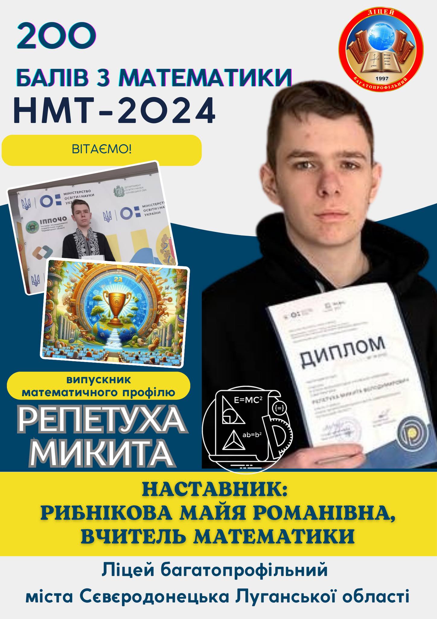 Так, Микита Репетуха набрав максимальну кількість балів у національному мультипредметному тесті з математики. Його наставник - Майя Рибнікова.