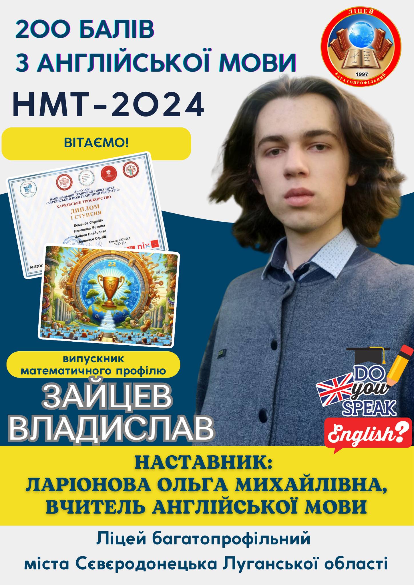 200 балів у НМТ з англійської мови отримав Владислав Зайцев, якого підготувала Ольга Ларіонова.