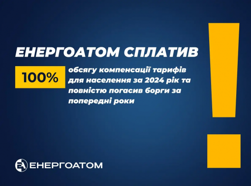 Енергоатом сплатив 100% обсягу компенсації тарифів для населення за 2024 рік та повністю погасив заборгованість за попередні роки
