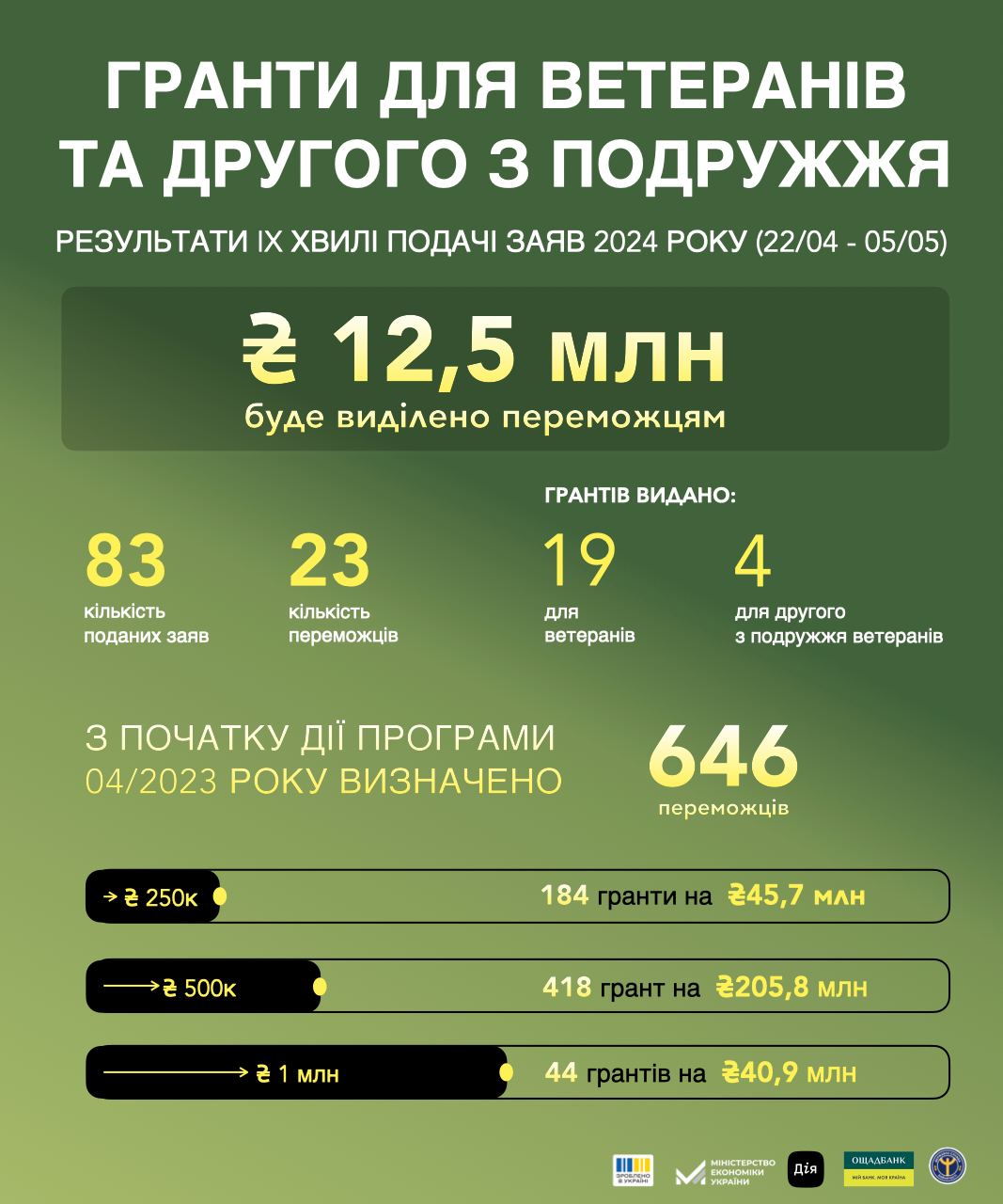 Серед 23 переможців дев’ятої хвилі подачі заяв на гранти 19 учасників бойових дій та 4 члени родин ветеранів. 17 переможців отримали грант розміром до 500 тис грн, 2 - до 250 тис грн, 4 - до 1 млн грн.