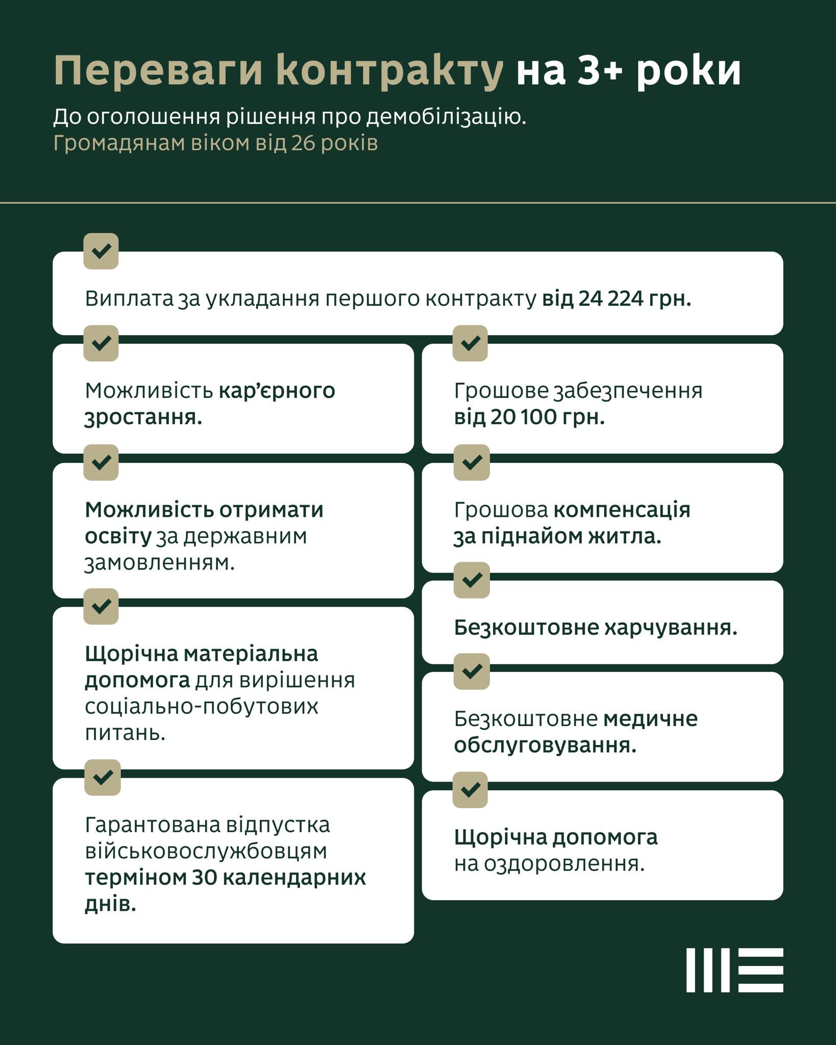 Чоловіки віком від 26 років мають можливість укладання контракту про проходження військової служби на строк від 3 (трьох) років.