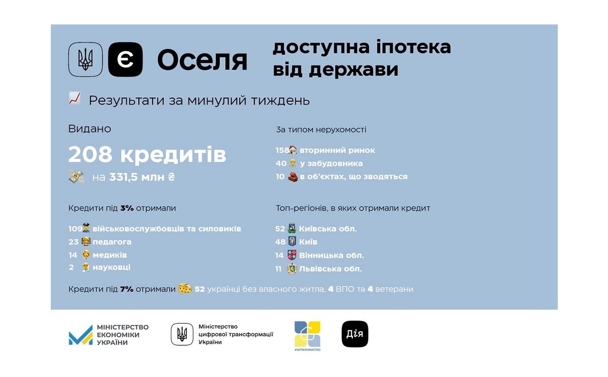 «Від початку дії програми єОселя кредити на придбання житла взяли майже 5,9 тисяч родин. За минулий тиждень було видано 208 кредитів на суму 331,5 млн грн. Зокрема, найбільше кредитів під 3% отримали військовослужбовці та силовики. Такою ж відсотковою ставкою можуть скористатися педагоги, медики та науковці. Всі інші українці, які не мають власного житла, можуть скористатися програмою на умовах масової іпотеки – під 7%», - повідомила заступник Міністра економіки України Надія Бігун.
