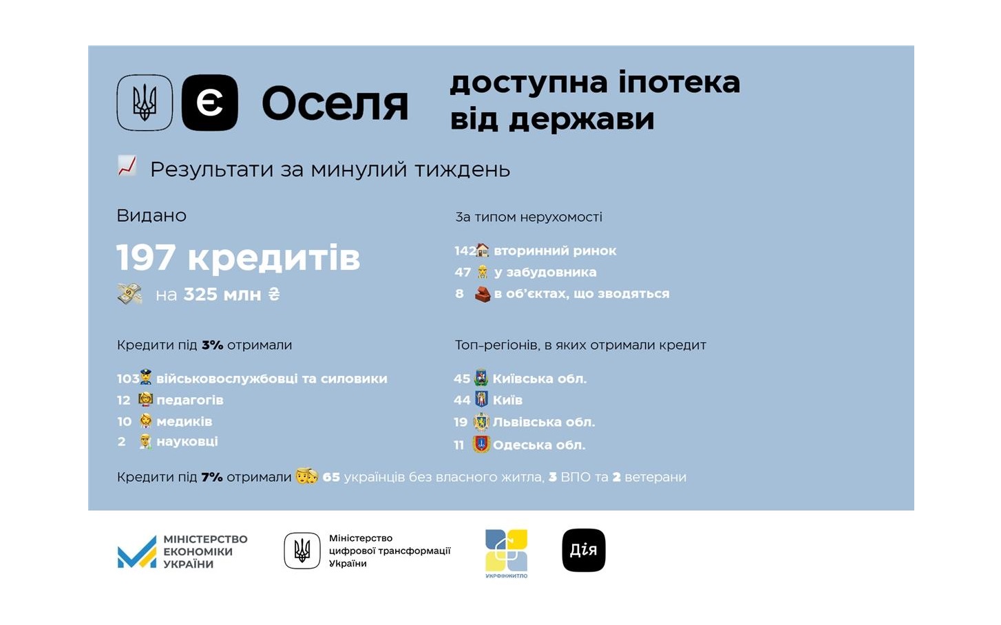 Зокрема, минулого тижня українці отримали за програмою єОселя 197 кредитів на 325 млн грн, серед яких: