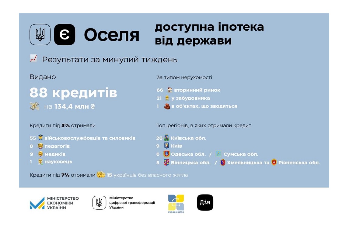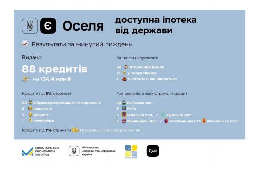 Зокрема, минулого тижня українці отримали за програмою єОселя 88 кредитів на 134 млн грн, серед яких: