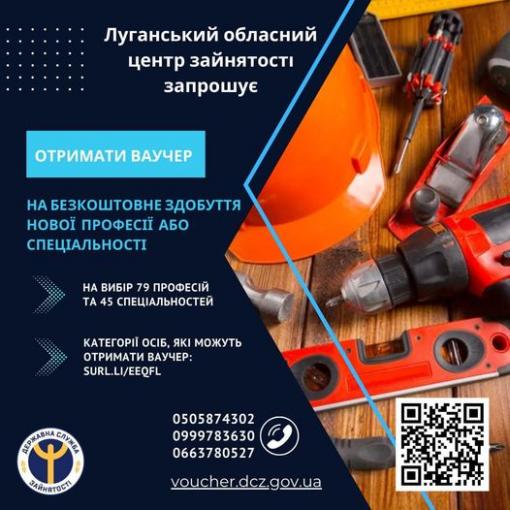 Луганський обласний центр зайнятості запрошує Вас скористатися можливістю отримати ваучер та безкоштовно здобути нову професію або спеціальність. На Ваш вибір 79 професій та 45 спеціальностей. Звертаємо Вашу увагу на те, що в Перелік професій та спеціальностей за якими може бути виданий ваучер, додали нову професію - "Сапер (розмінування)". Обирайте те, що цікавить саме Вас та звертайтеся до нас!