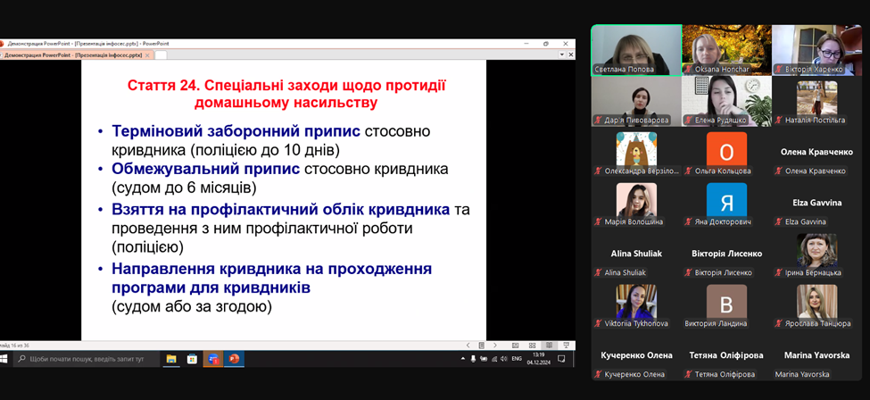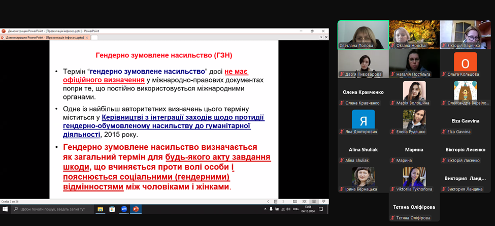 Управлінням соціального захисту населення відновлено проведення онлайн консультацій для відповідальних за заходи реагування на випадки домашнього насильства та насильства за ознакою статі по закладах загальної середньої освіти, підпорядкованих Управлінню освіти Сєвєродонецької міської ВА. На цей раз  до заходу долучились представники Сєвєродонецької окружної прокуратури та Краматорського відділу надання безоплатної правничої допомоги Південно-Східного міжрегіонального центру з надання безоплатної правничої допомоги. На порядок денний були винесені такі питання: