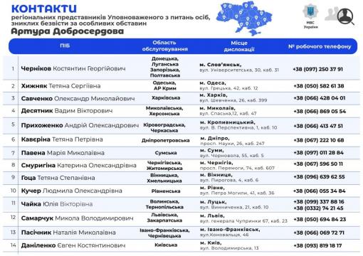 Уповноважений з питань осіб, зниклих безвісти за особливих обставин нагадує, що по всім питанням, пов'язаним з пошуком та ідентифікацією зниклих безвісти осіб, а також для координації з правоохоронними органами та іншими структурами, можна звертатися до регіональних представників Уповноваженого з питань осіб, зниклих безвісти за особливих обставин або безпосередньо до самого Уповноваженого Артура Добросердова:
