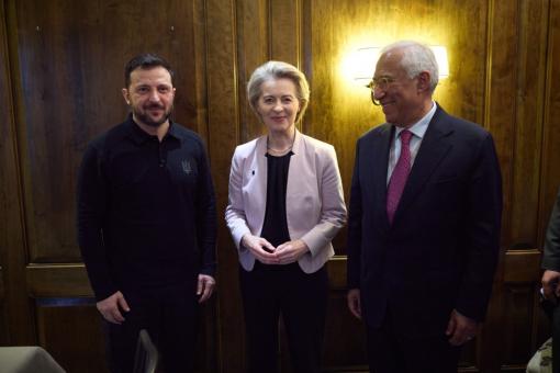 У Мюнхені Президент Володимир Зеленський провів зустріч із Президентом Європейської ради Антоніу Коштою та Президенткою Європейської комісії Урсулою фон дер Ляєн і подякував за підтримку України.