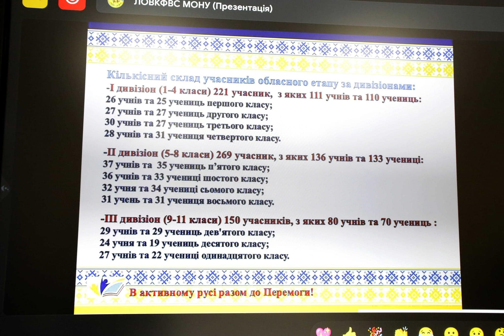Зокрема у фінальному обласному етапі змагались 640 учасників, з них 313 учениць та 327 учнів, які представляли 45 закладів загальної середньої освіти області.