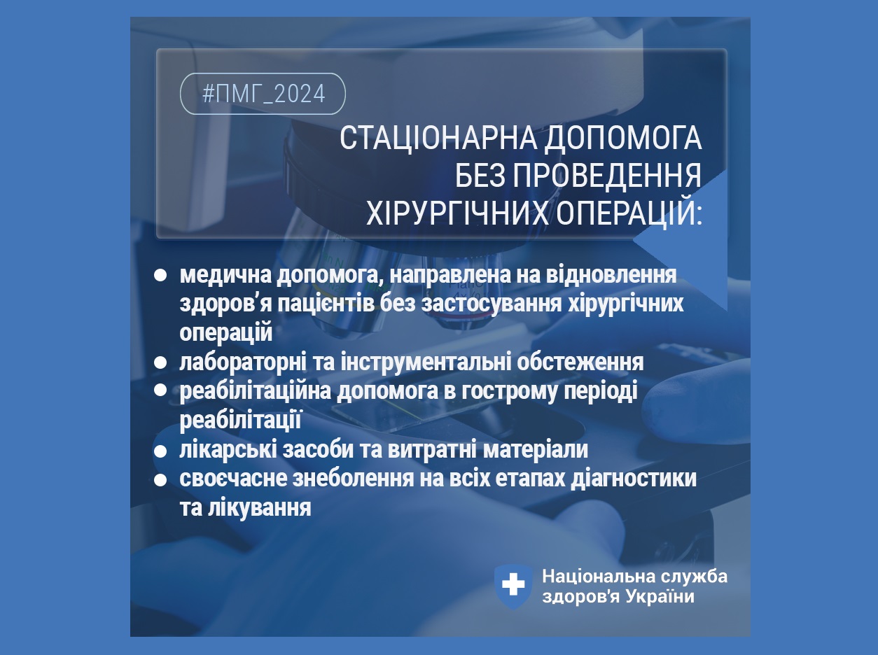 Повний перелік безоплатних послуг та вимоги до закладів, які надають допомогу в межах пакету “Стаціонарна допомога дорослим і дітям без проведення хірургічних операцій” можна переглянути на сайті НСЗУ в розділі “Вимоги ПМГ 2024” (п. 38).