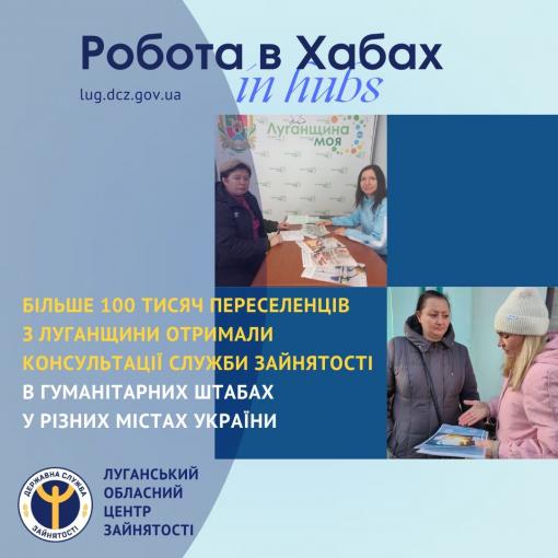 29 фахівців служби зайнятості на постійній основі надають інформаційні послуги в гуманітарних хабах «Луганщина моя». Переселенці можуть отримати тут різноманітну інформацію: як стати на облік в центр зайнятості, який розмір виплат допомоги по безробіттю, які є актуальні вакансії, програми сприяння зайнятості населення, можливості професійного навчання, отримання ваучера тощо.