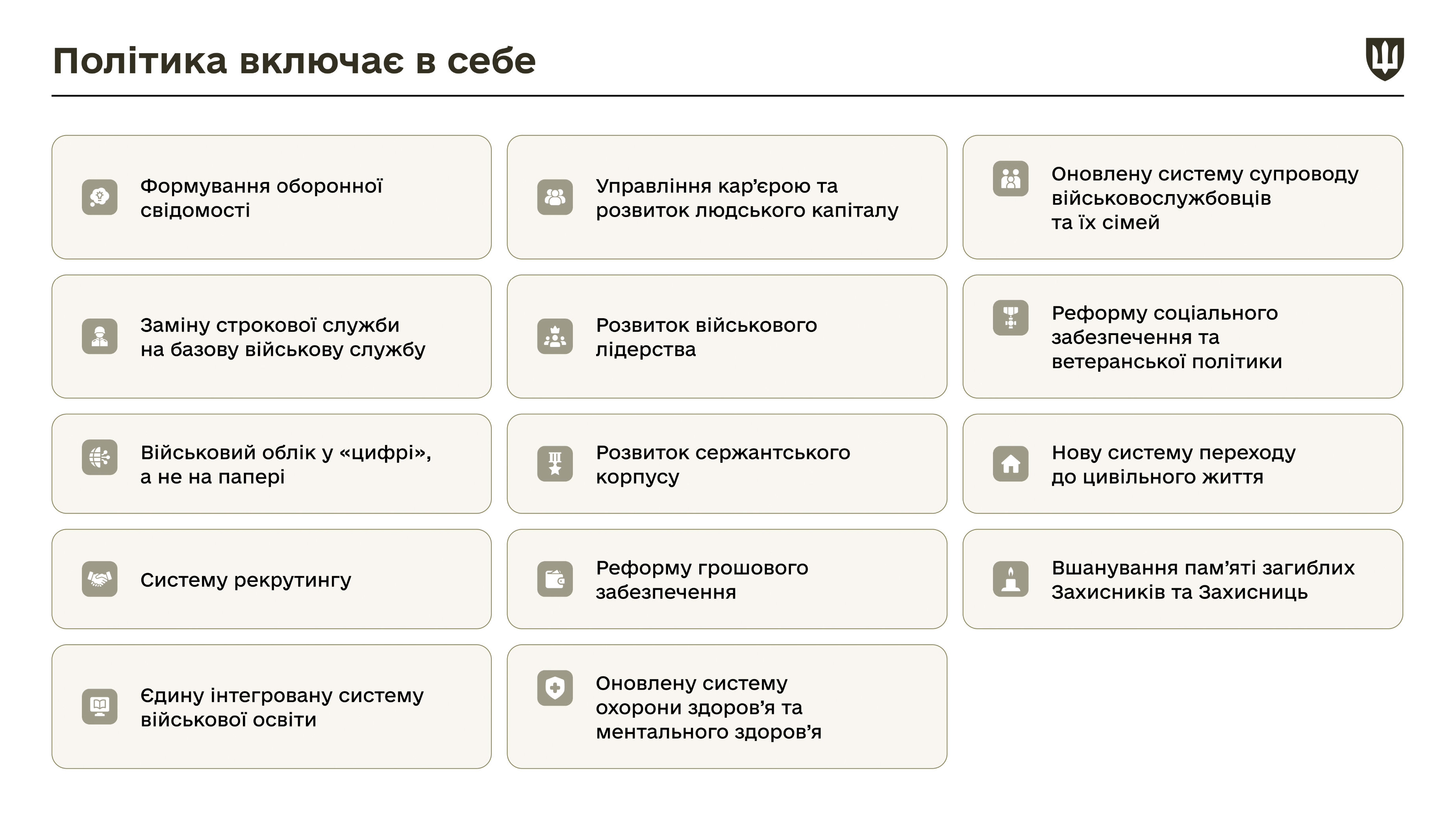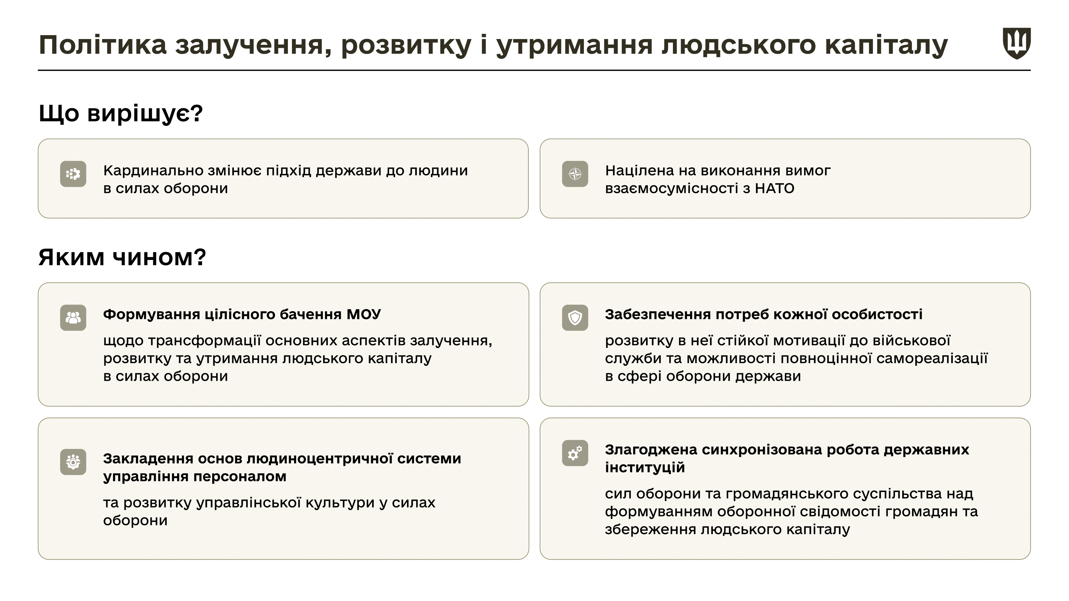 Новою політикою закладаються основи людиноцентричної системи управління персоналом та розвитку управлінської культури у силах оборони.