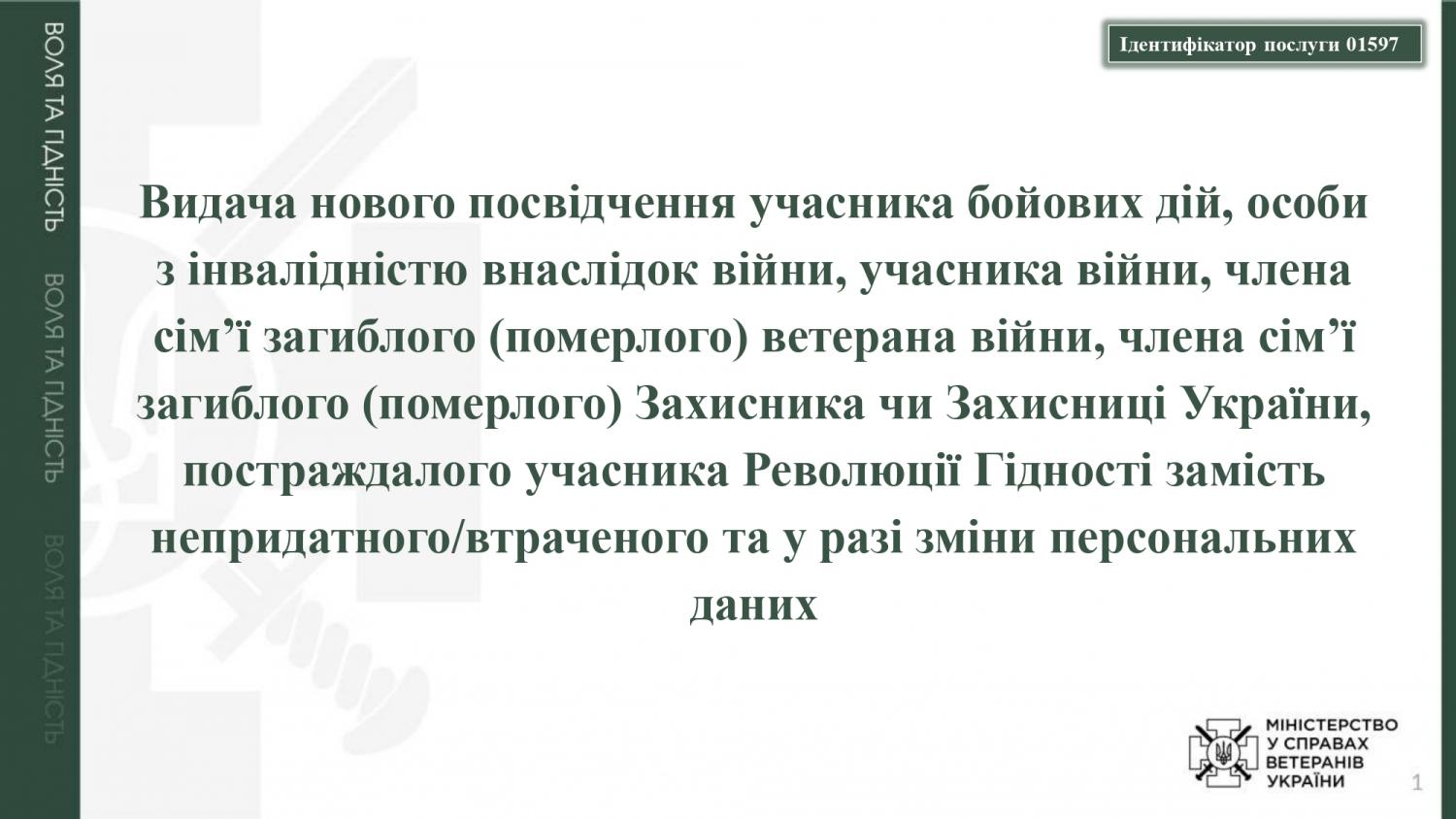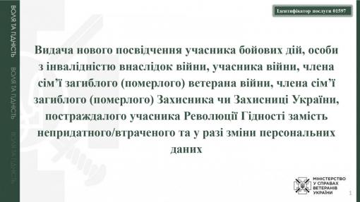 Назва адміністративної послуги: "Видача нового посвідчення учасника бойових дій, особи з інвалідністю внаслідок війни, учасника війни, члена сім’ї загиблого (померлого) ветерана війни, члена сім’ї загиблого (померлого) Захисника чи Захисниці України, постраждалого учасника Революції Гідності замість непридатного/втраченого та у разі зміни персональних даних".